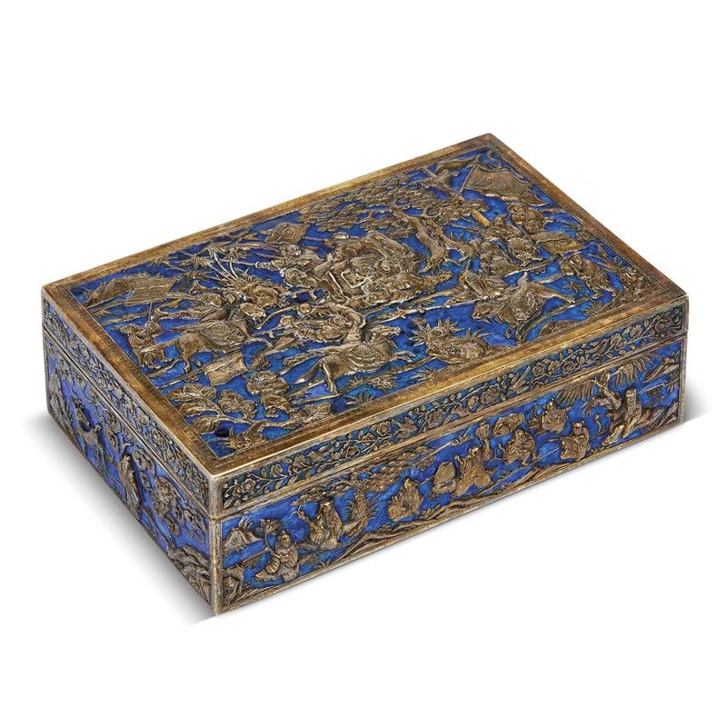 SCATOLA, CINA, DINASTIA QING, SEC. XIX in argento con smalto blu raffigurante otto immortali e dei guerrieri su dei cavalli, Shoulao con un cervo e un saggio con un giovane. Reca un marchio inciso sotto la base. Alt. cm 6 Lungh. cm 19 Prof. cm 12 清 十九世纪 银烧蓝錾刻刀马人物故事八仙纹盒 高6 厘米 宽19厘米 纵深12厘米