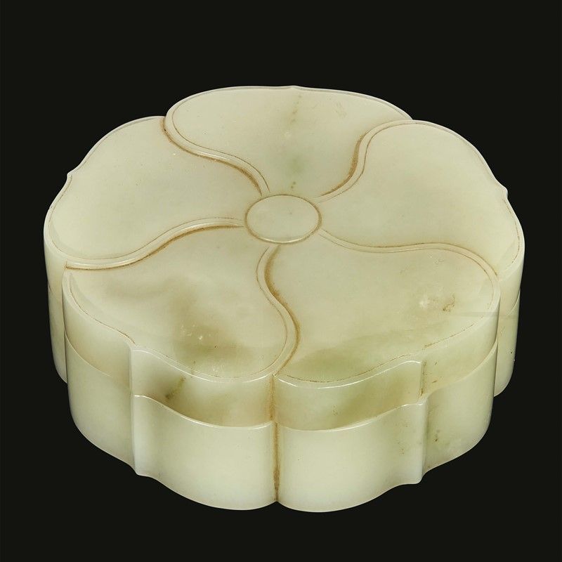 清 十九世纪 青白玉雕五瓣莲盖盒 高 4厘米 直径 11,3厘米