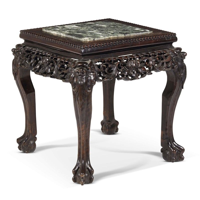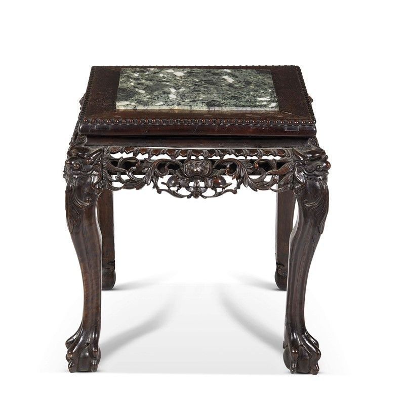 TAVOLINO, CINA, DINASTIA QING, SEC. XIX in legno duro e marmo verde, il legno è intagliato con fiori di loto e rami avvolgenti. Ha quattro gambe con delle facce di creature mitologiche. Alt. cm 52 Lungh. cm 50 Prof. cm 50 清 十九世纪 硬木雕缠枝莲纹兽足几 高 52厘米 宽 50厘米 纵深 50厘米