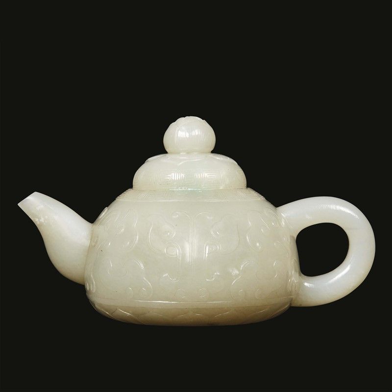 in giada bianca, decorato con motivi Hui. La presa del coperchio è a forma di fiore di loto; il corpo è decorato con il drago Kui e la base con petali di fiori di loto.