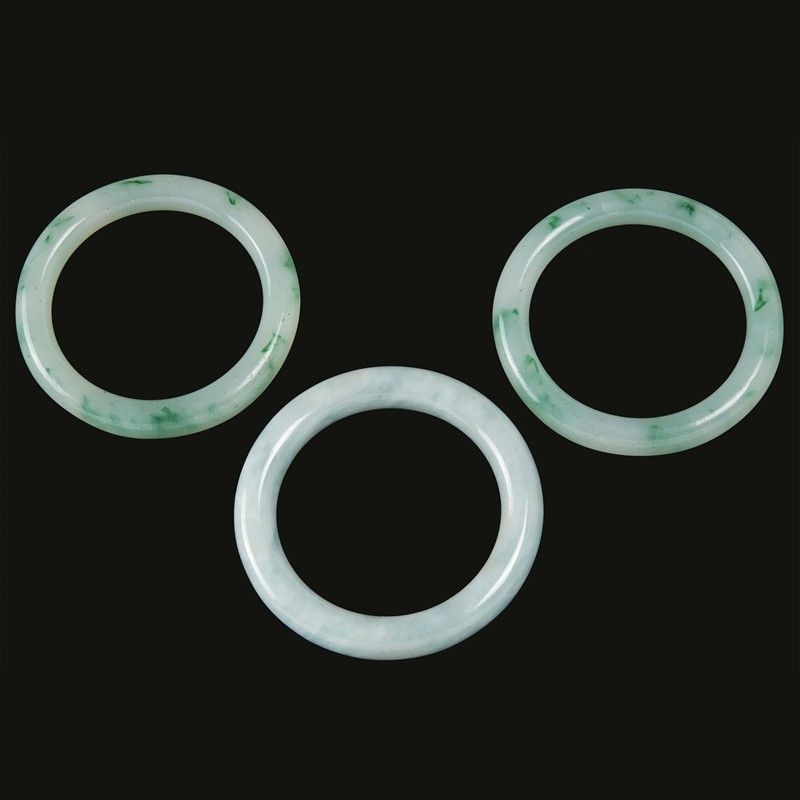 清 十九世纪 飘花翡翠手镯一对及白翡翠手镯一只
