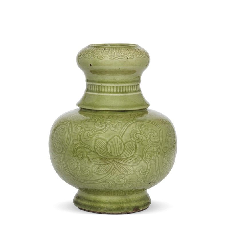in porcellana, con smalto Longquan celadon verde, su cui sono incisi fiori di loto.