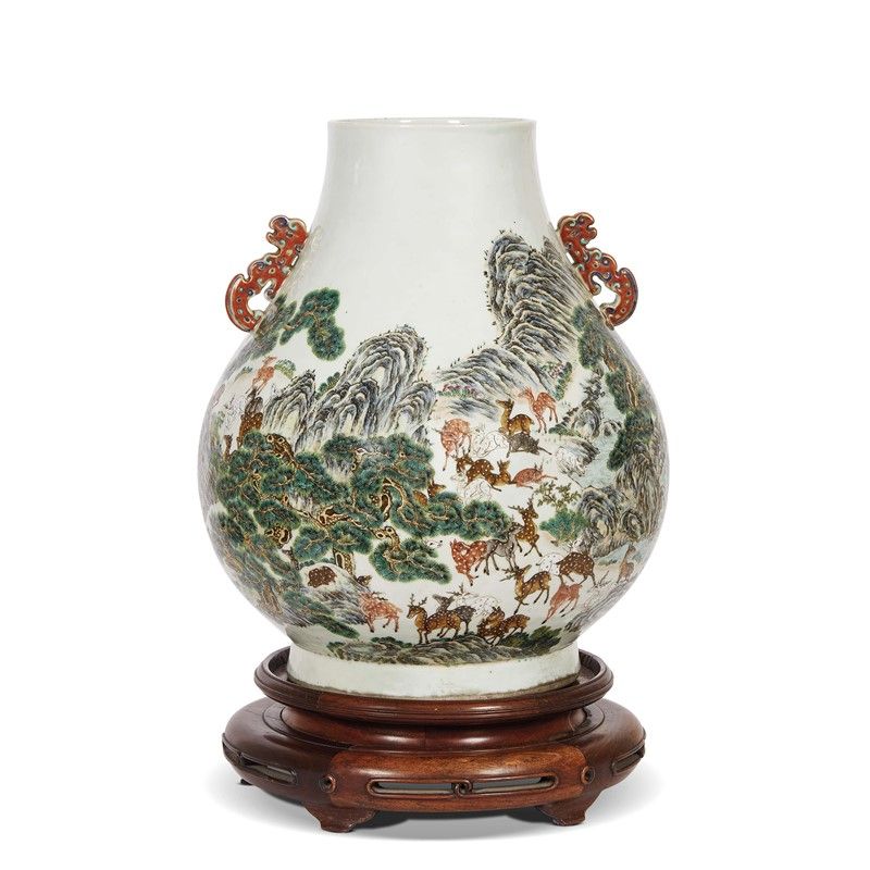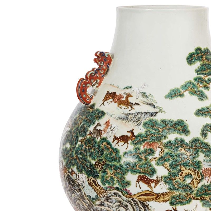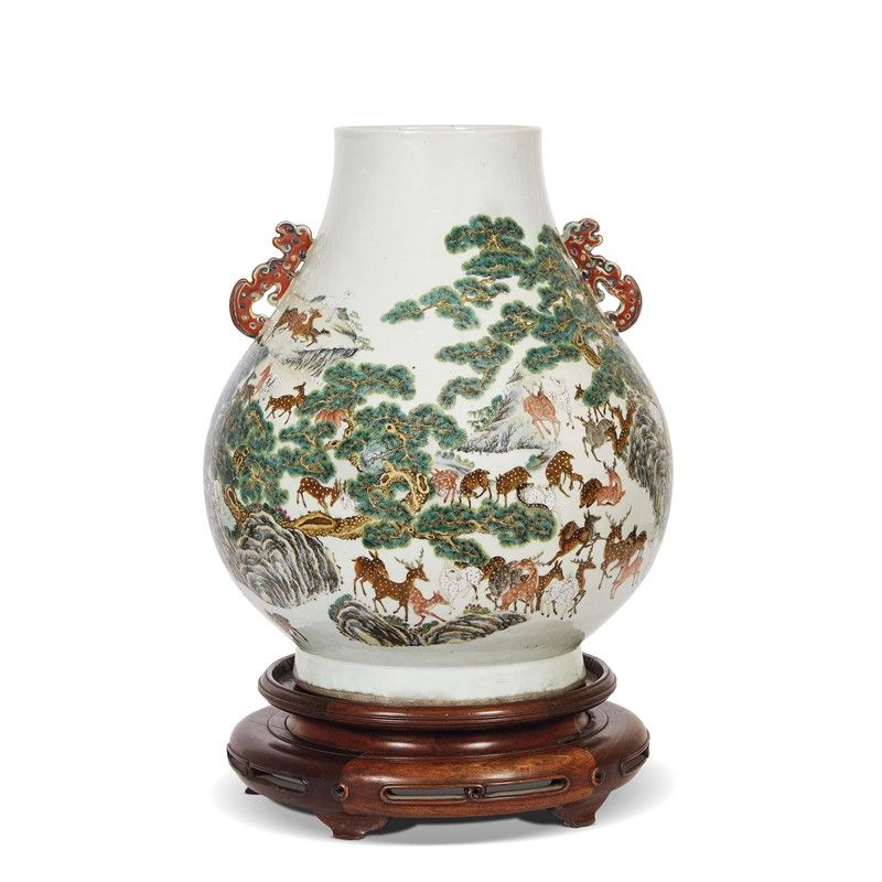 in porcellana policroma, a forma Hu, dipinto con cento cervi e alberi di pino e due anse color rosso corallo a forma di drago.