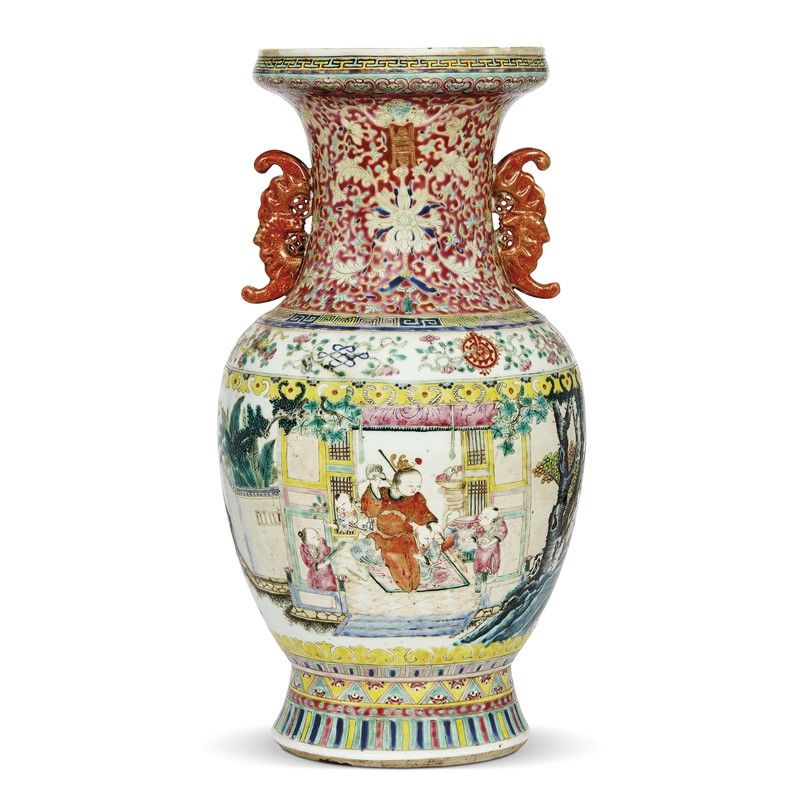 in porcellana della famiglia rosa, decorato con bambini che giocano con tesori preziosi, con anse a forma di pipistrello.