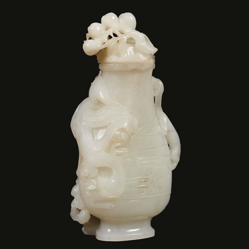 清 十八至十九世纪 和田玉凤舞龙蟠纹盖瓶 高 15,5厘米