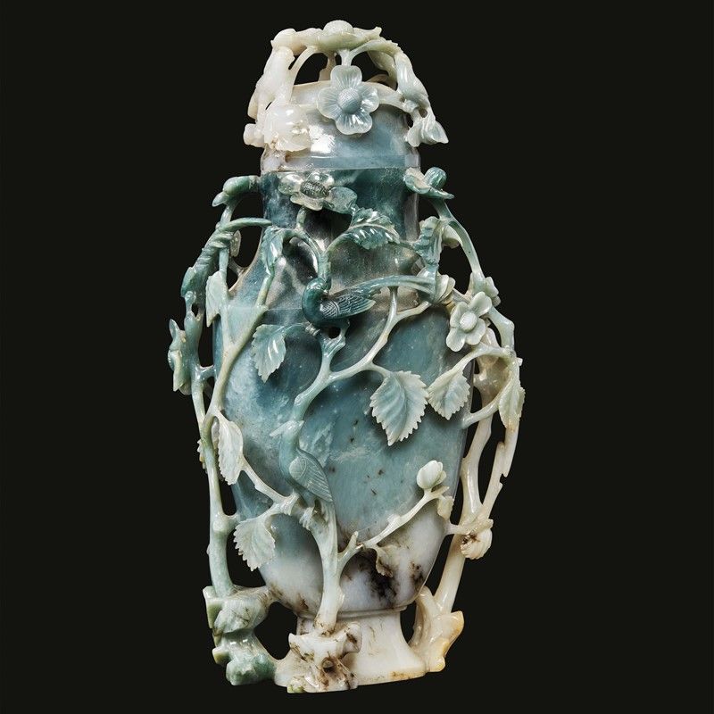 in giadeite color verde e bianco intagliato con fiori, rami di foglie Mei e volatili.