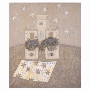 70x60 cm. Roma 1938 Per un cielo senza stelle, 1974, olio su tela, firmato e datato in basso a destra, firmato, [..]