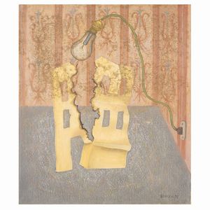78x68 cm. Roma 1938 La lampada impazzita, 1977, olio su tela, firmato e datato in basso a destra, firmato, titolato [..]