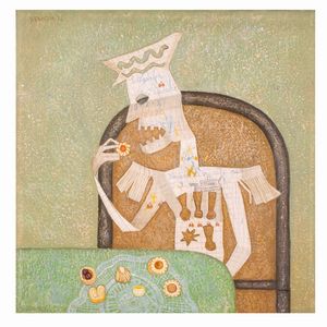 70x70 cm. Roma 1938 Il ghiotto generale, 1974, olio su tela, firmato e datato in alto a sinistra, firmato, titolato [..]