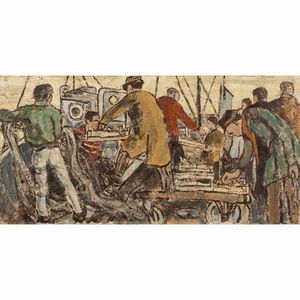 60x120 cm. Roma 1922 - Ascoli Piceno 2023 Lo sbarco del pesce, 1973, olio su tela, firmato in basso a sinistra, [..]