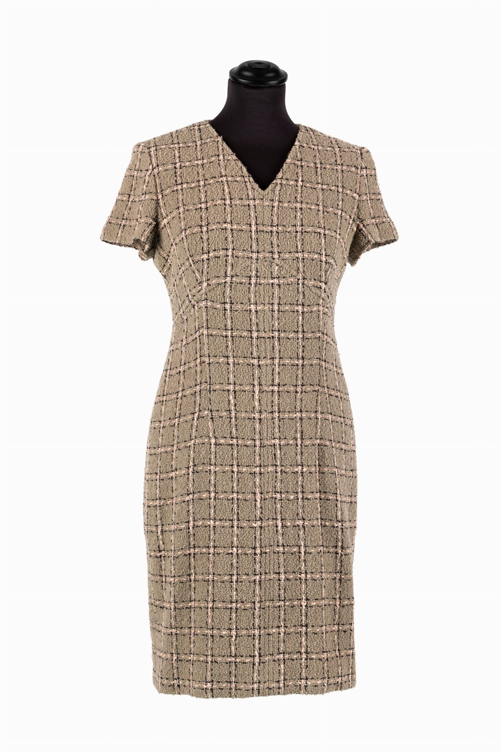 in lana bouclé color tortora e rosa, bottoni logati, fodera in seta, taglia 40 francese (difetti)