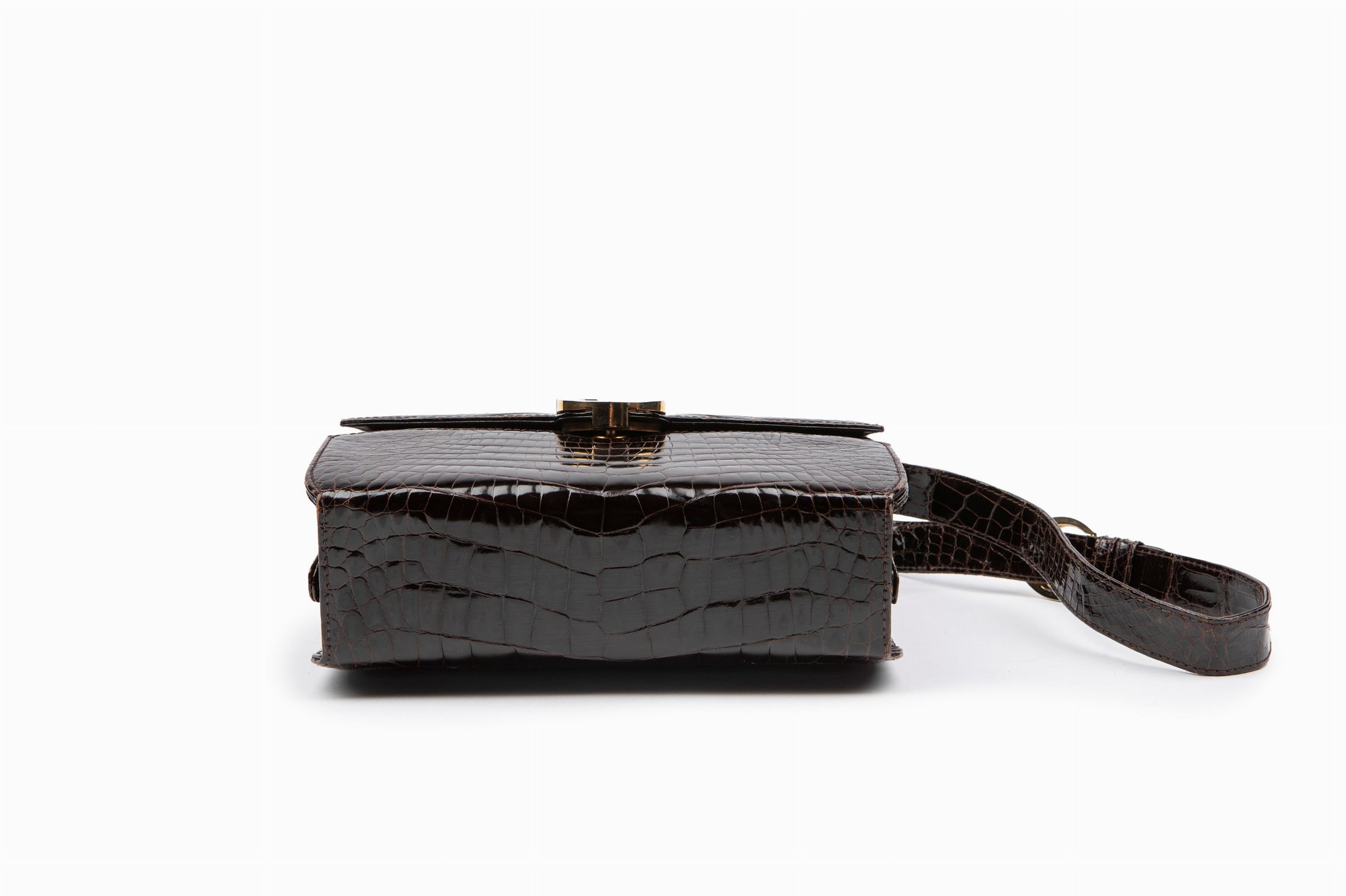 in coccodrillo color cioccolato con tracolla, dettagli in metallo dorato e argentato, interno in pelle, cm 24 (lievi difetti)