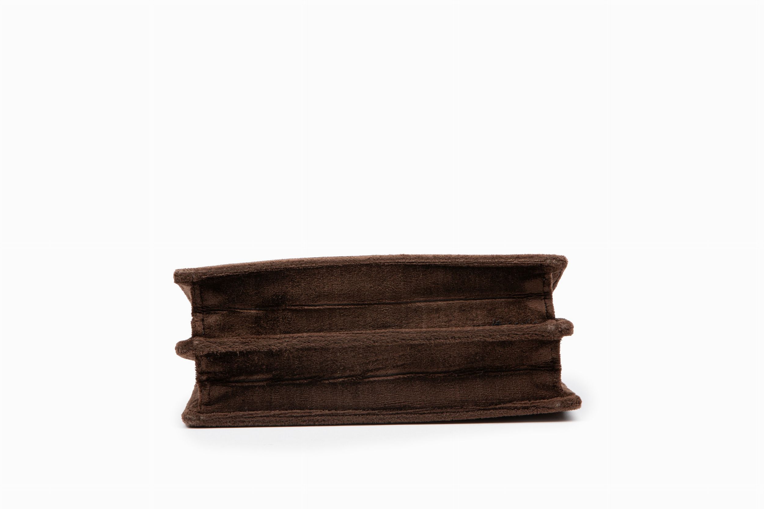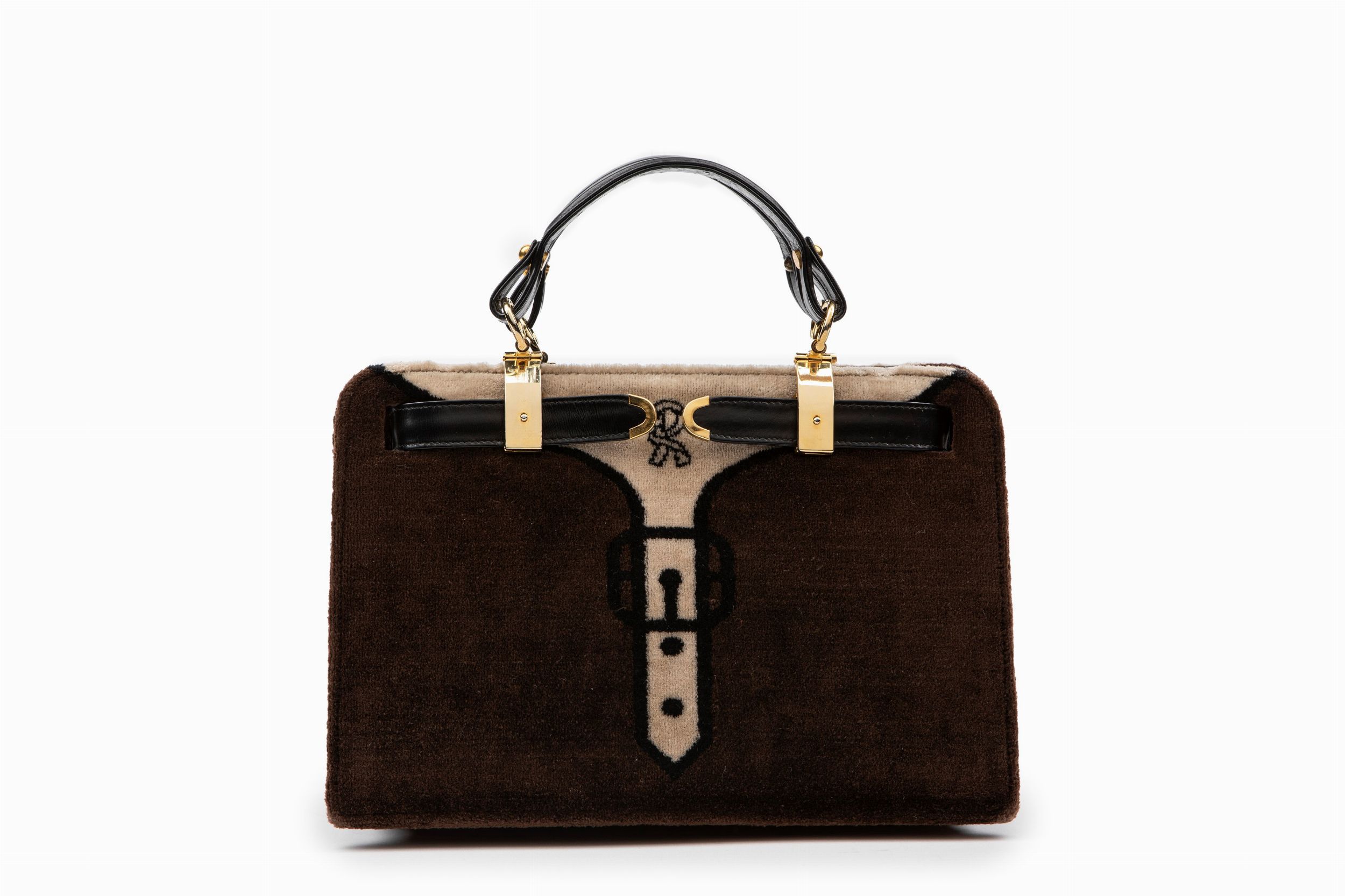 in velluto color marrone, beige e nero, doppi manici in pelle, dettagli in metallo dorato, cm 27 (lievi difetti)