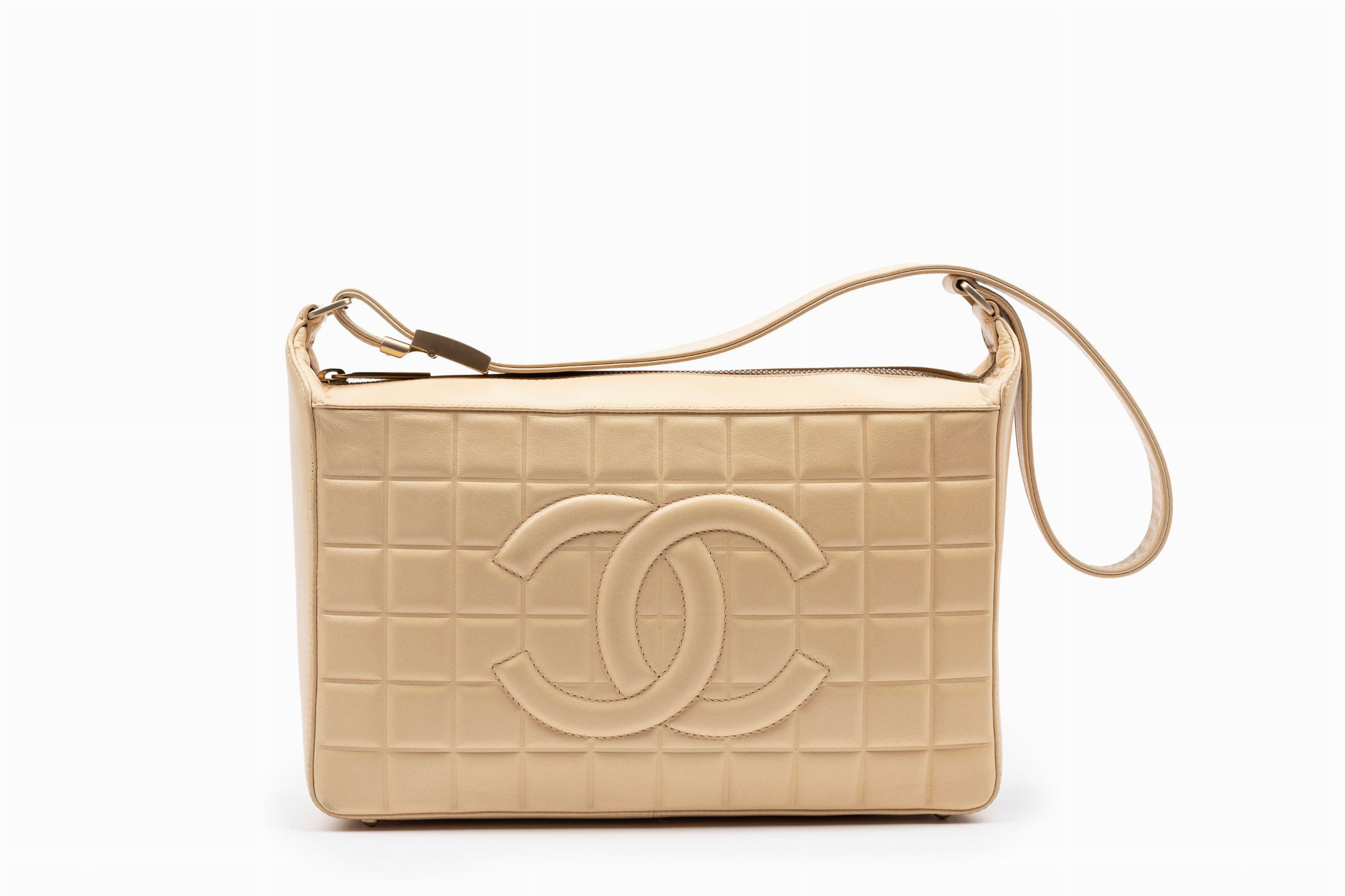 2003 in pelle trapuntata color beige con tracolla regolabile, fodera in tessuto logato, dettagli in metallo dorato satinato, cm 27, con scatola (lievissimi difetti)