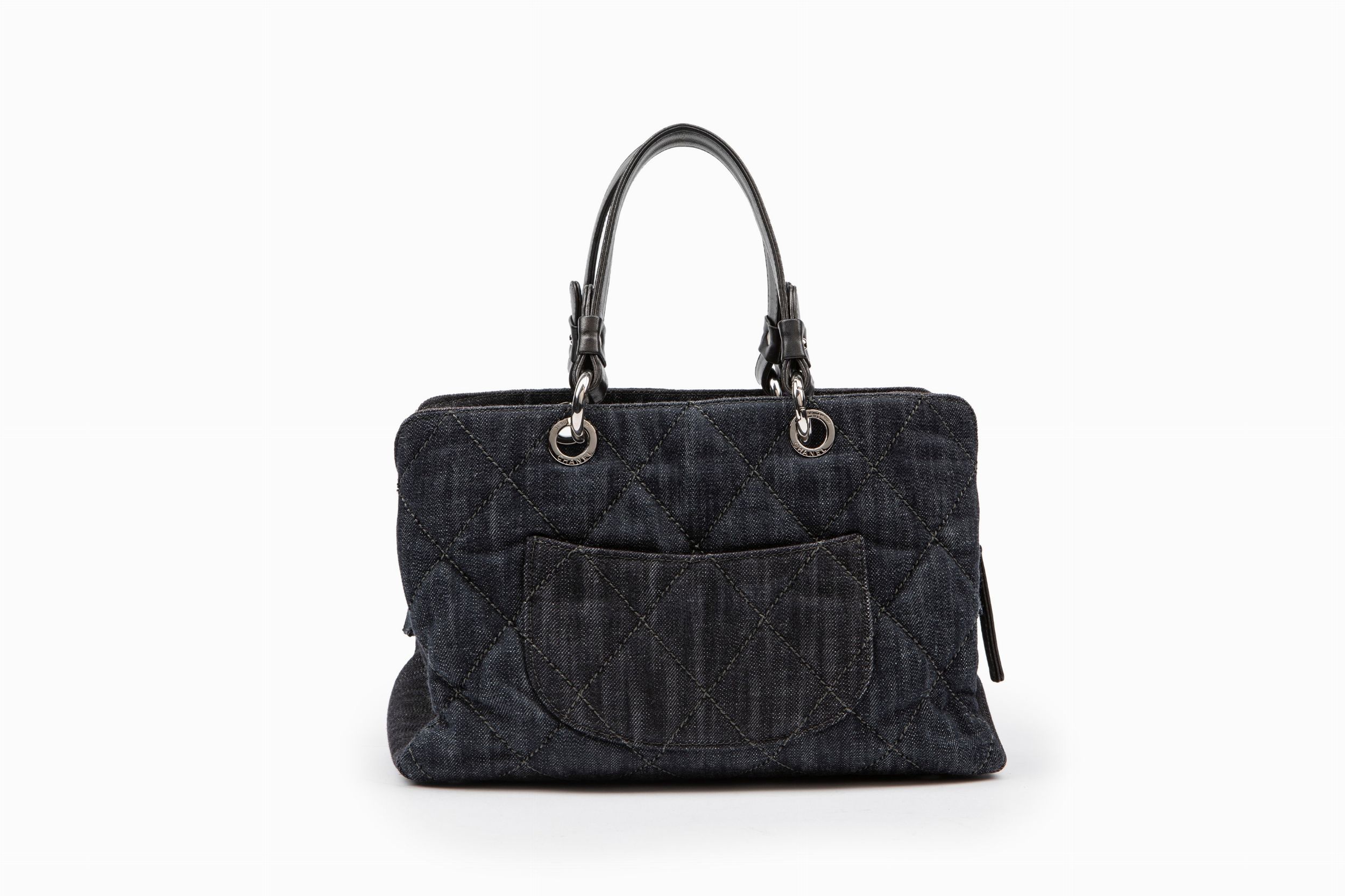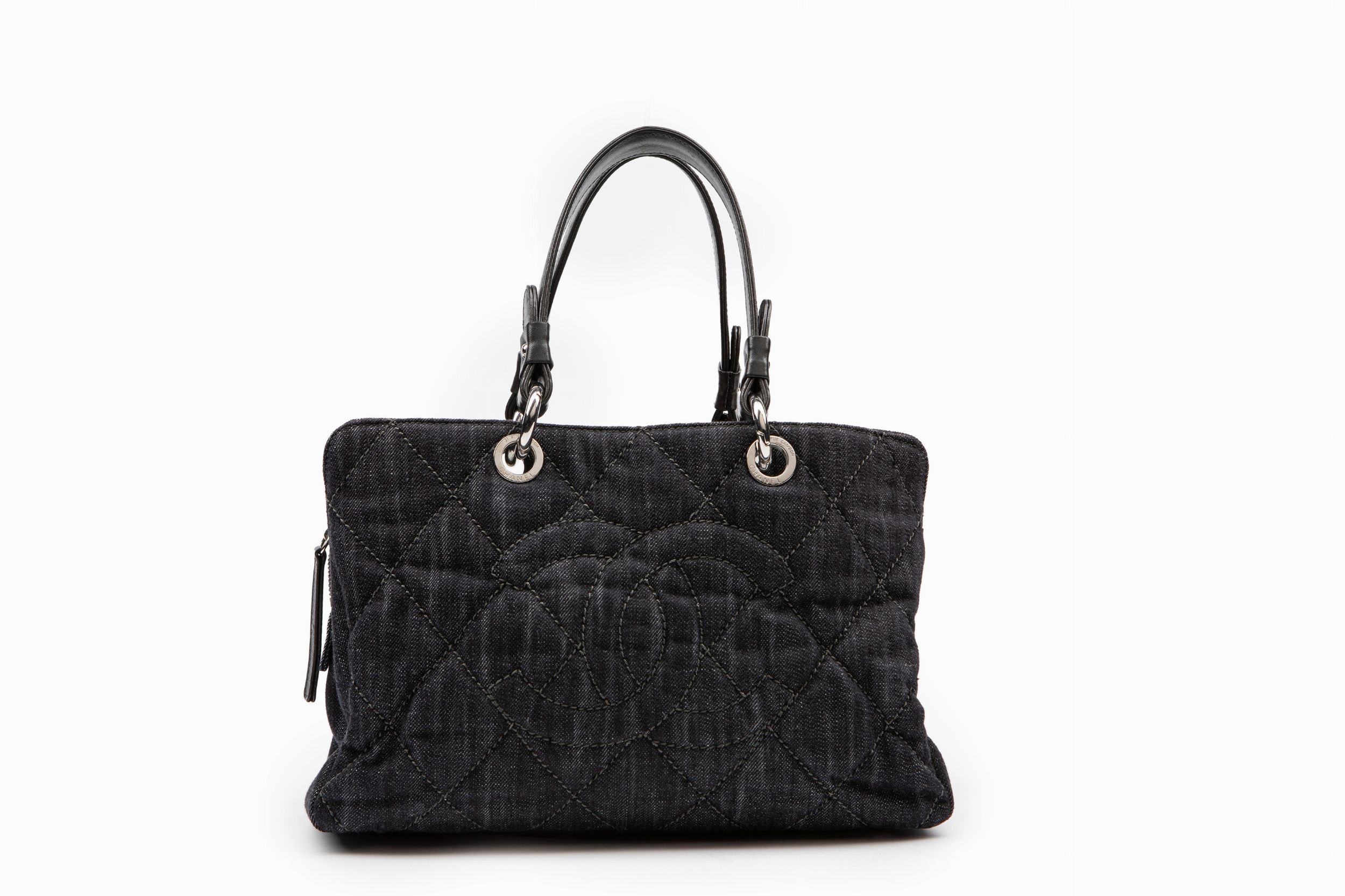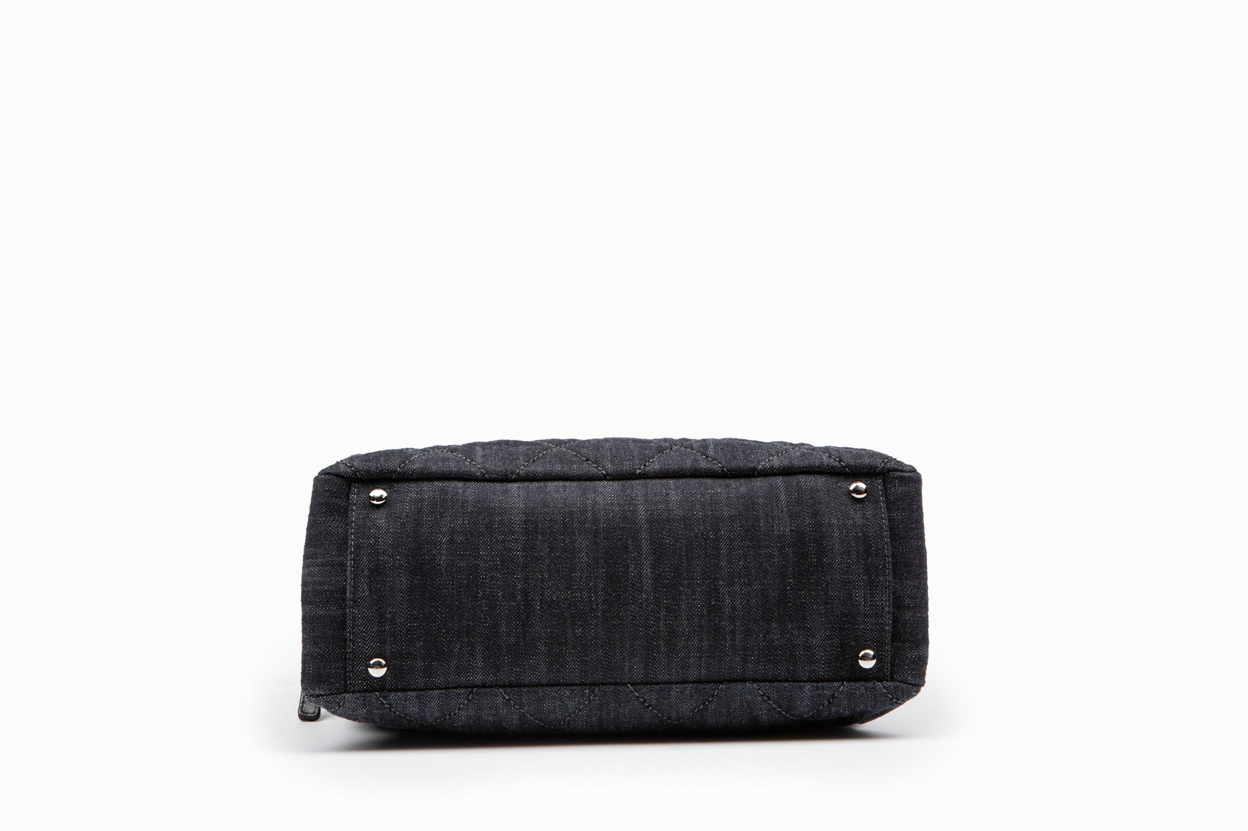 2008 in tela denim con doppi manici in pelle color grigio scuro, dettagli in metallo, triplo scomparto interno, cm 30, con sacchetto