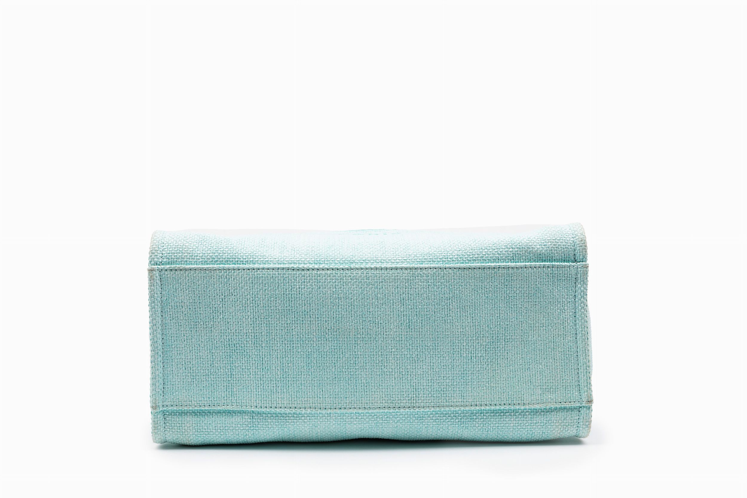 2017 in raffia color verde acqua, doppi manici in pelle e tracolla a catena in metallo, cm 38, con sacchetto (lievi difetti)
