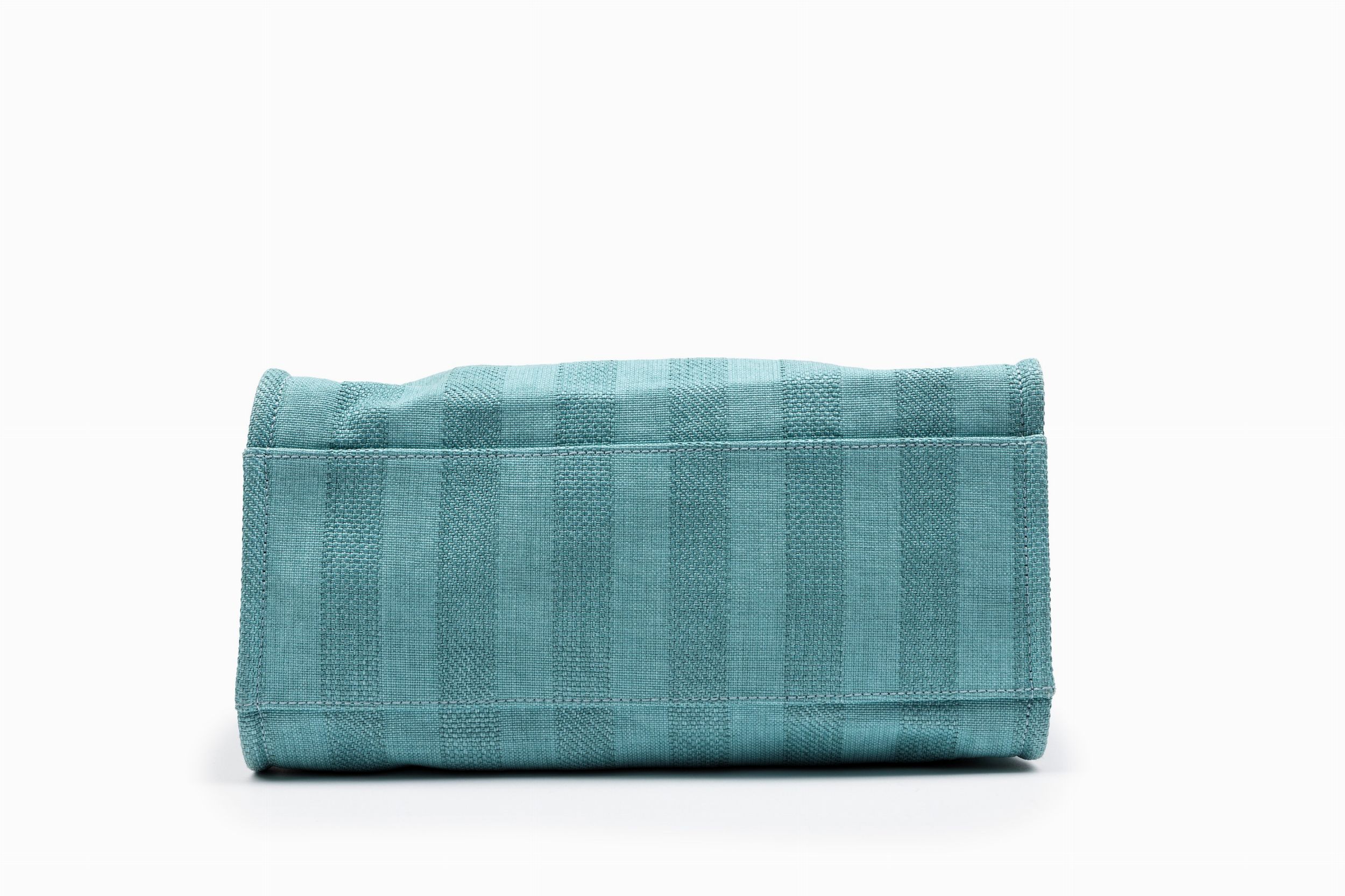 2019 in tela a righe color azzurro, doppi manici e tracolla in pelle e a catena in metallo, cm 38, con sacchetto