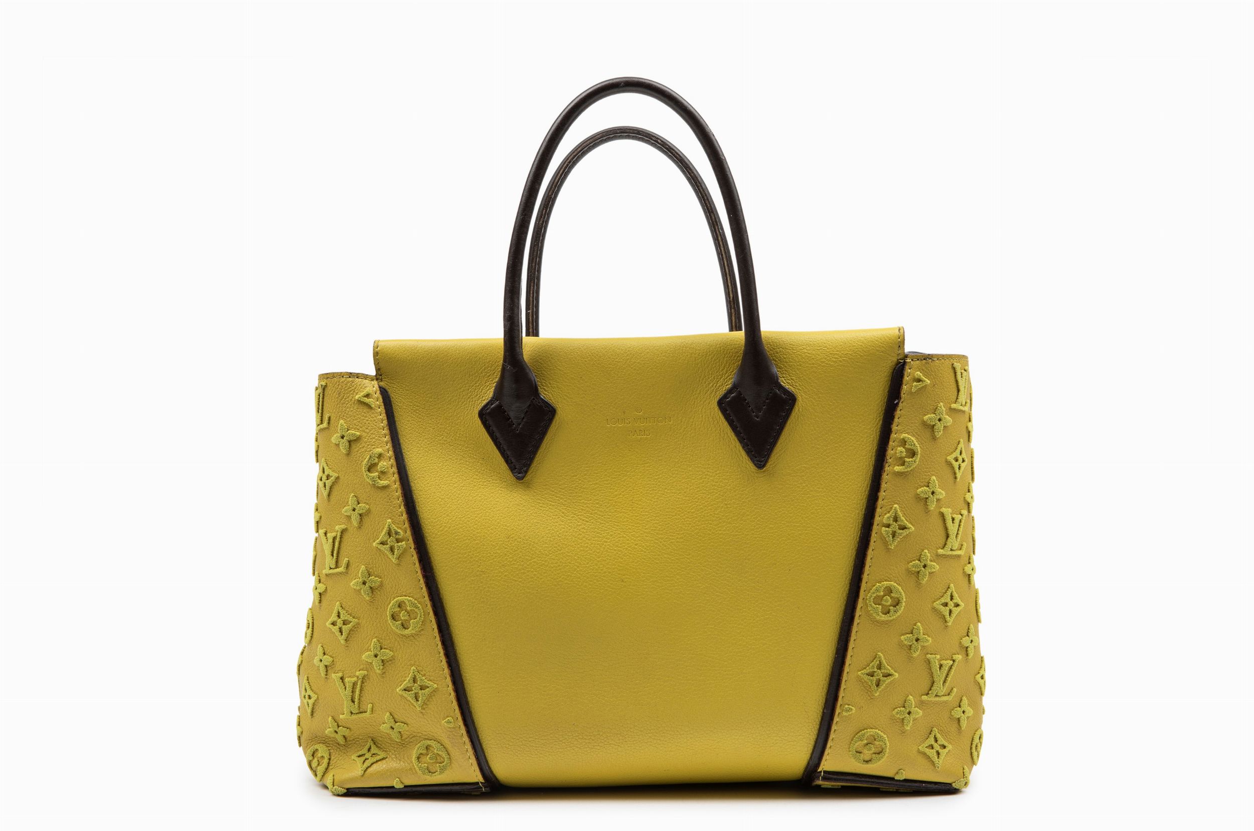 in pelle color lime, doppi manici e profili in pelle, interno in suede color marrone, dettagli in metallo, cm 35 (difetti)