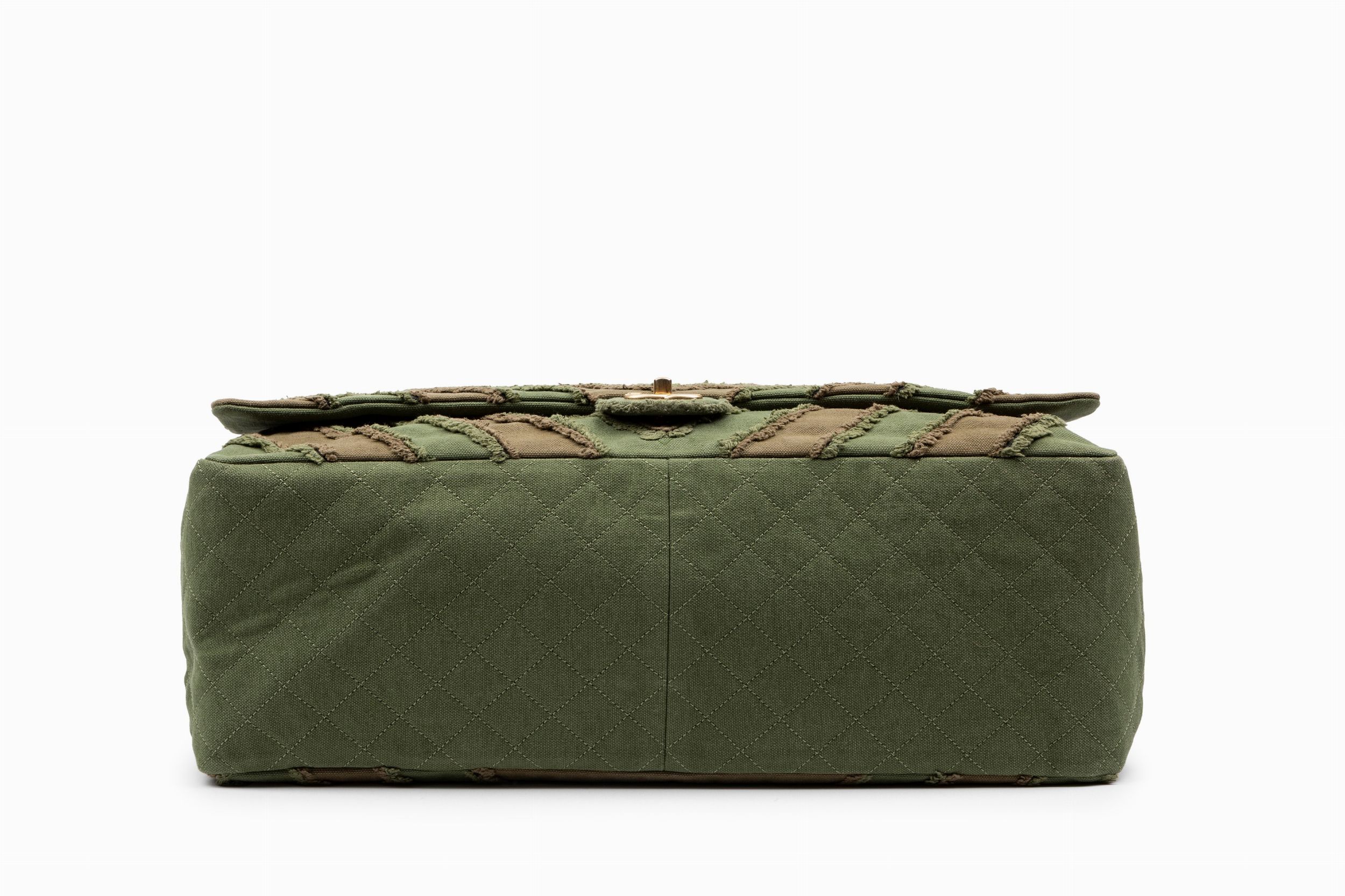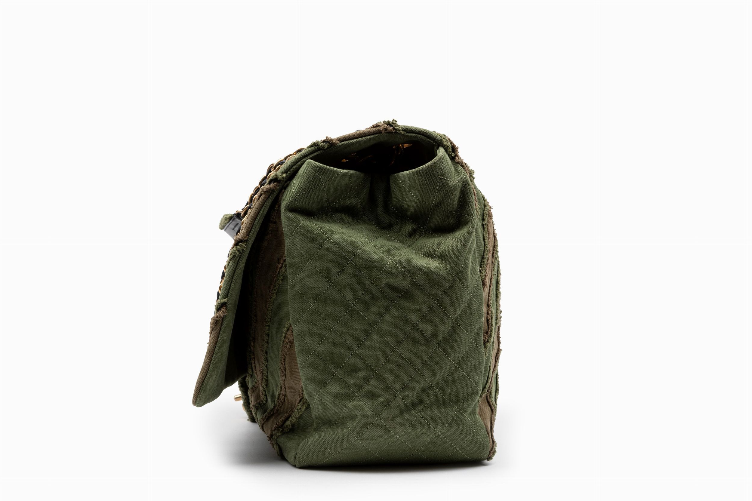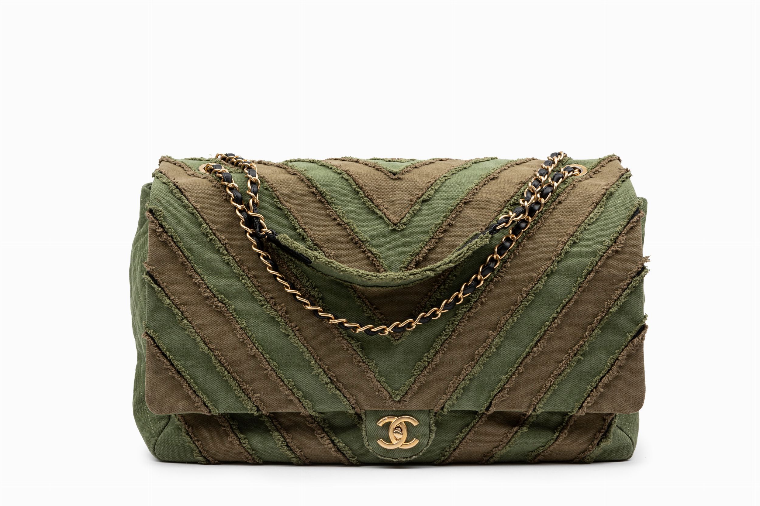 2017 in tessuto a motivo chevron bicolore tonalità di verdi, tracolla a catena in metallo dorato, cm 46, con sacchetto (lievissimi difetti)