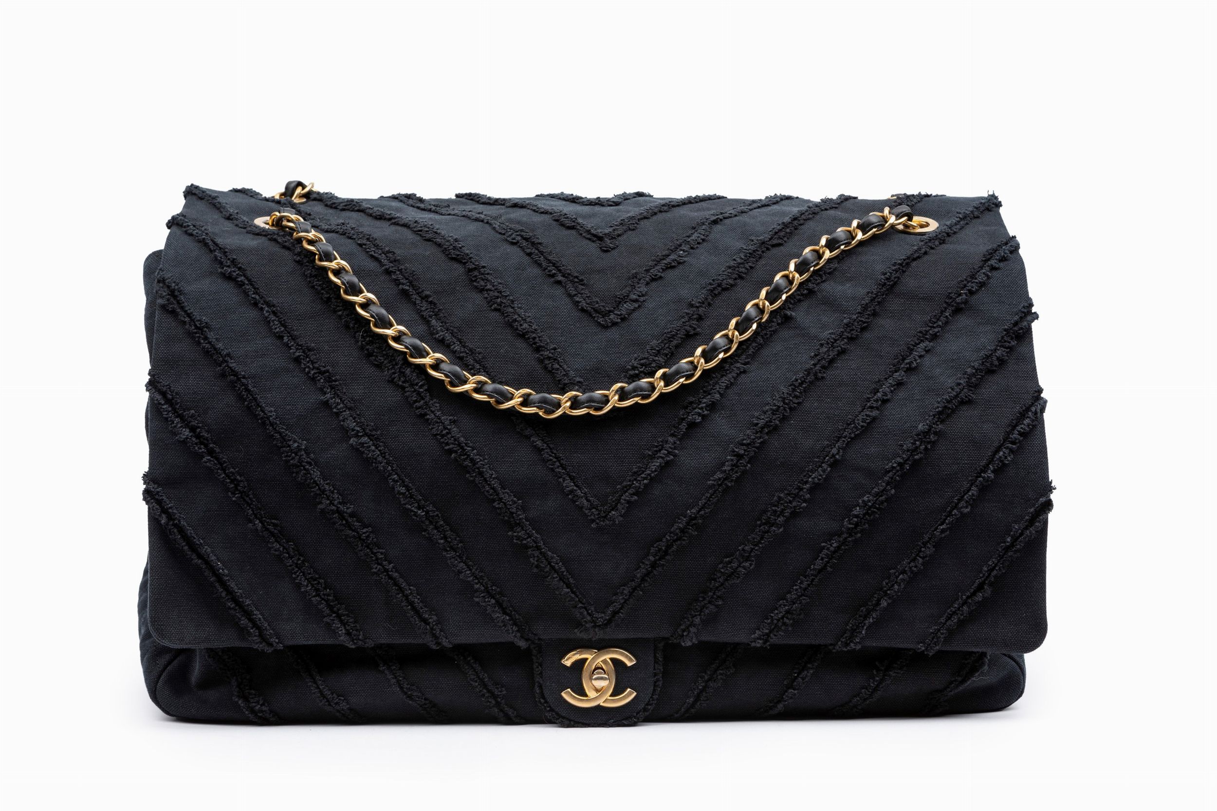 2017 in tessuto lavorato a motivo chevron color blu notte, tracolla a catena, dettagli in metallo dorato, cm 46, con sacchetto (difetti)