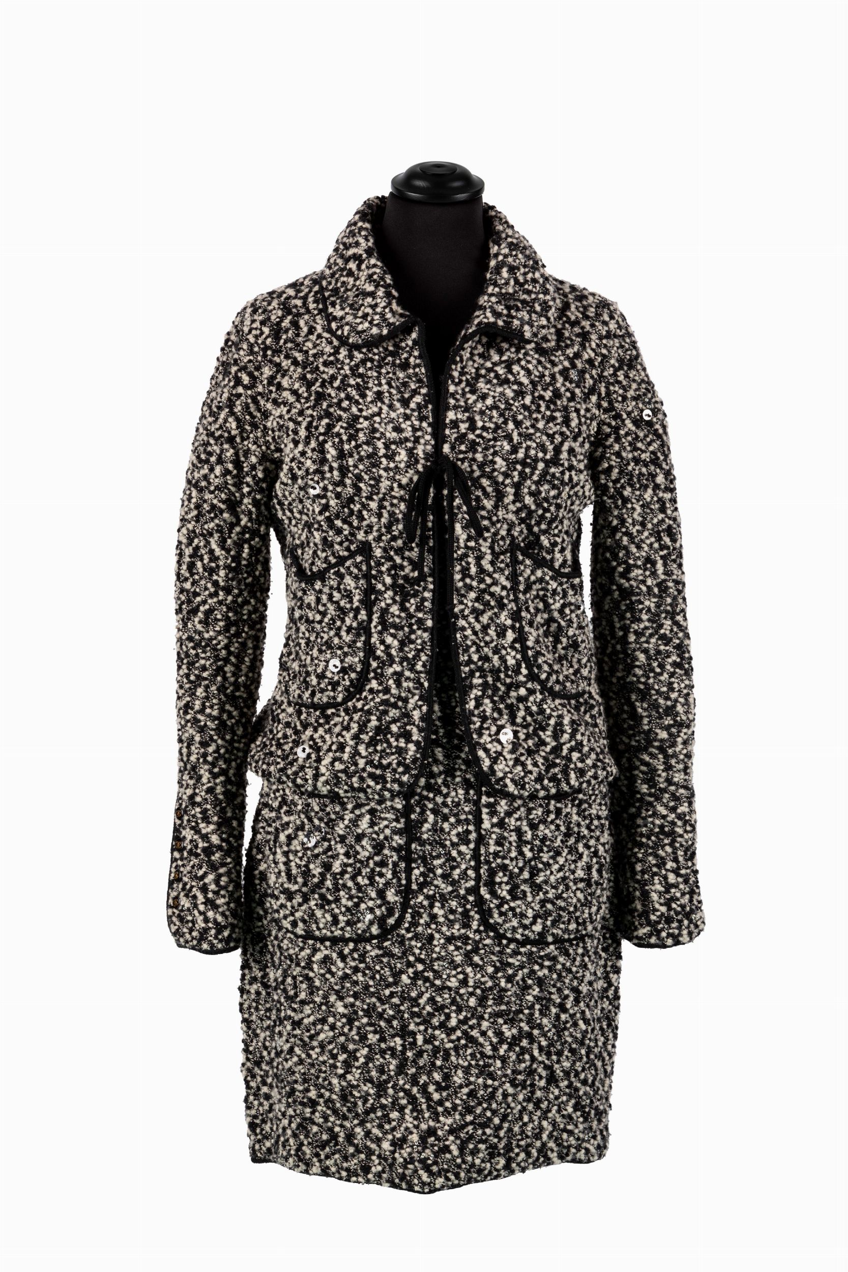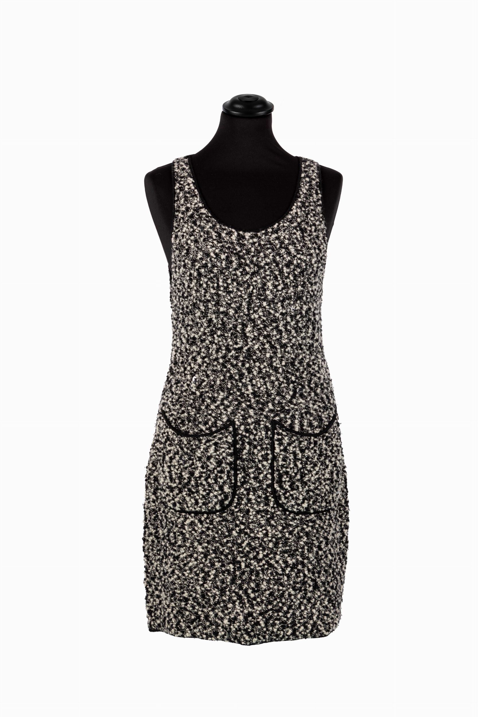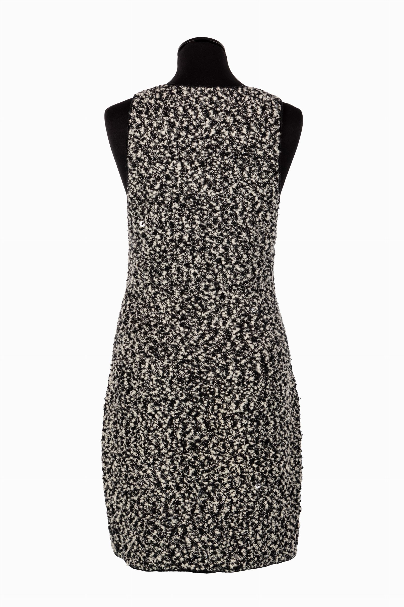 da un abito sfoderato senza maniche con tasche frontali, lana bouclé bianco e nero, e da una giacca a manica lunga, bottoni logati, applicazioni di paillettes trasparenti, etichette della taglia staccate, con custodia