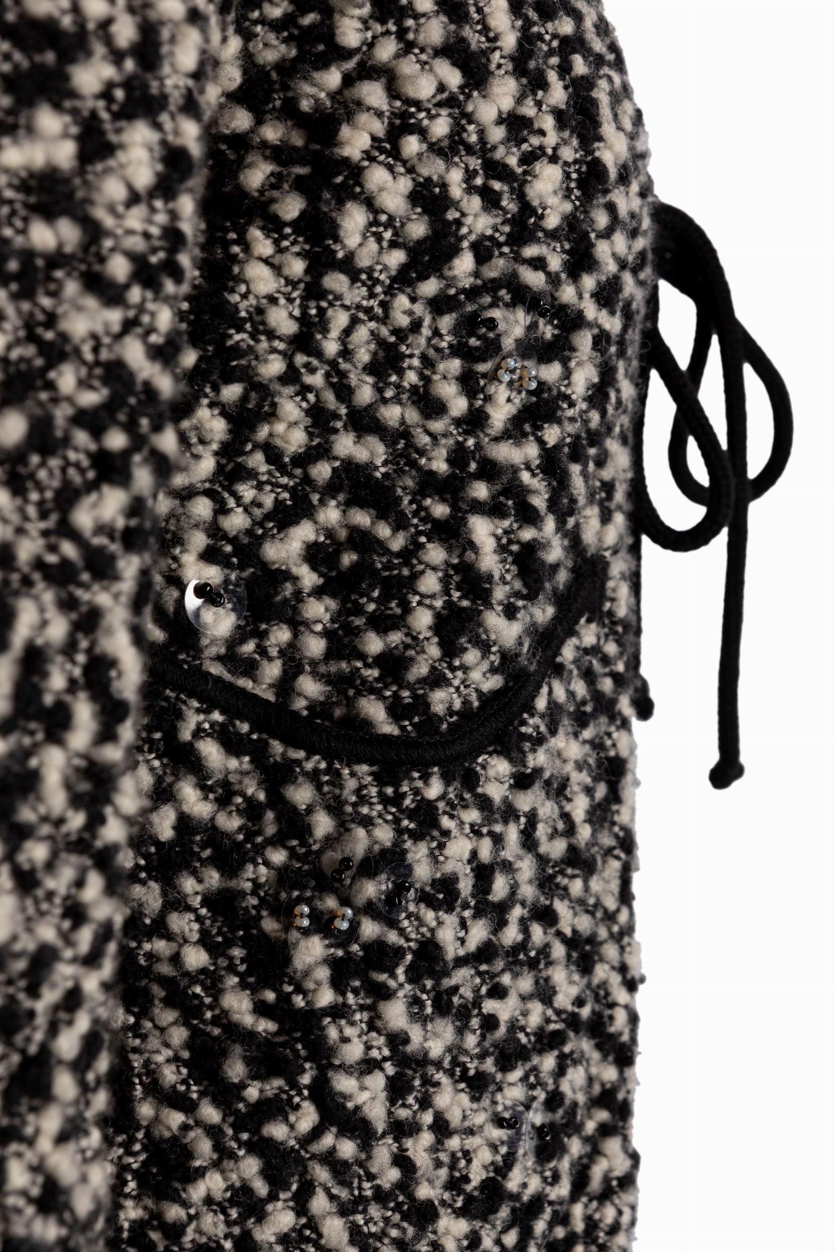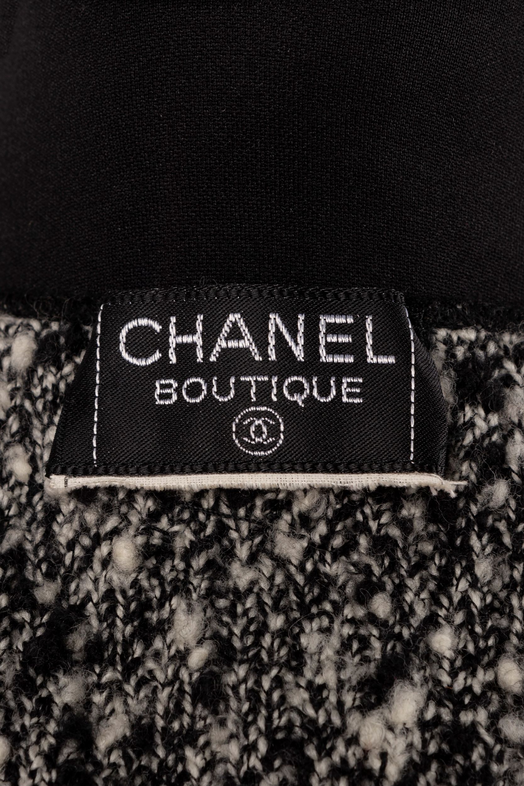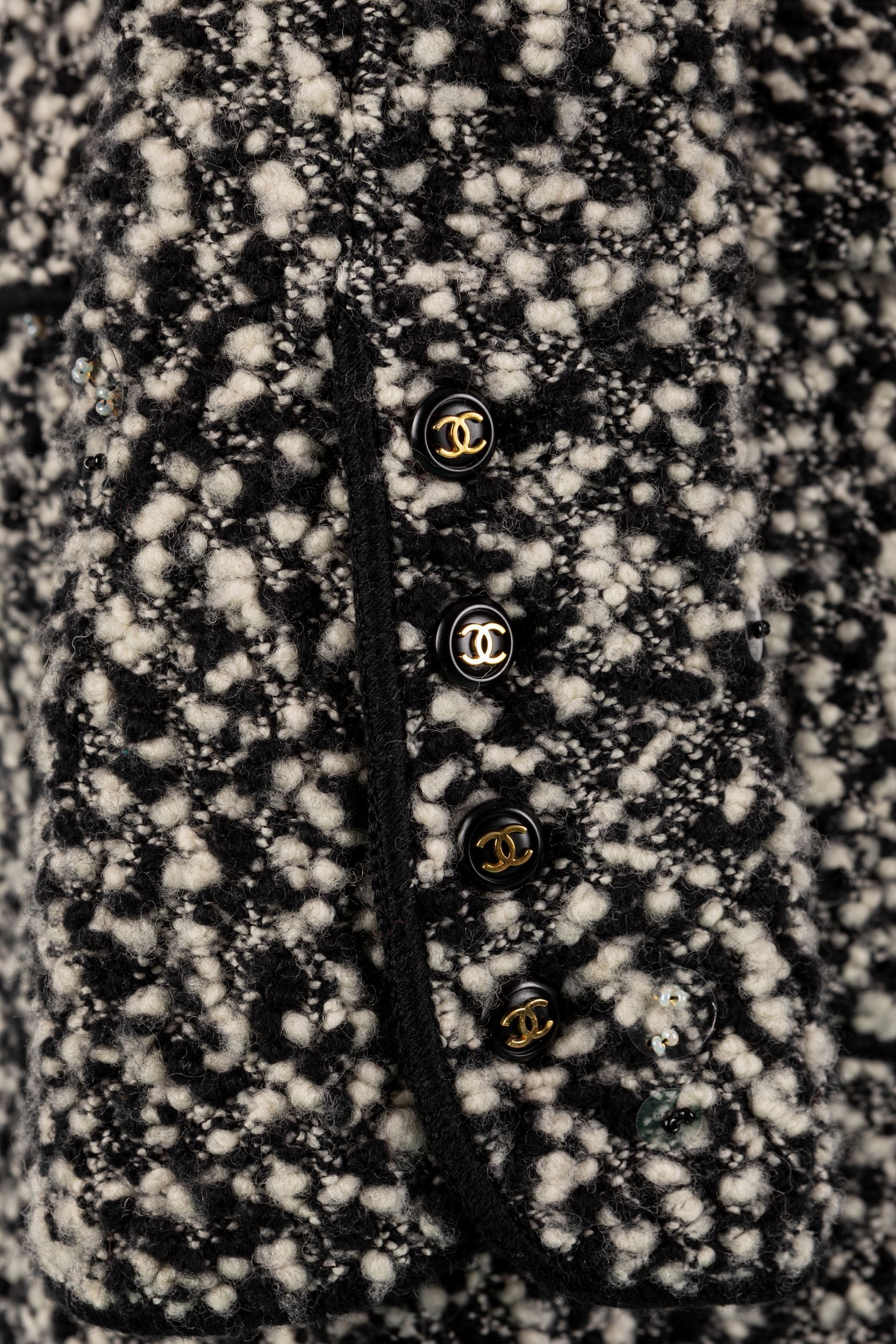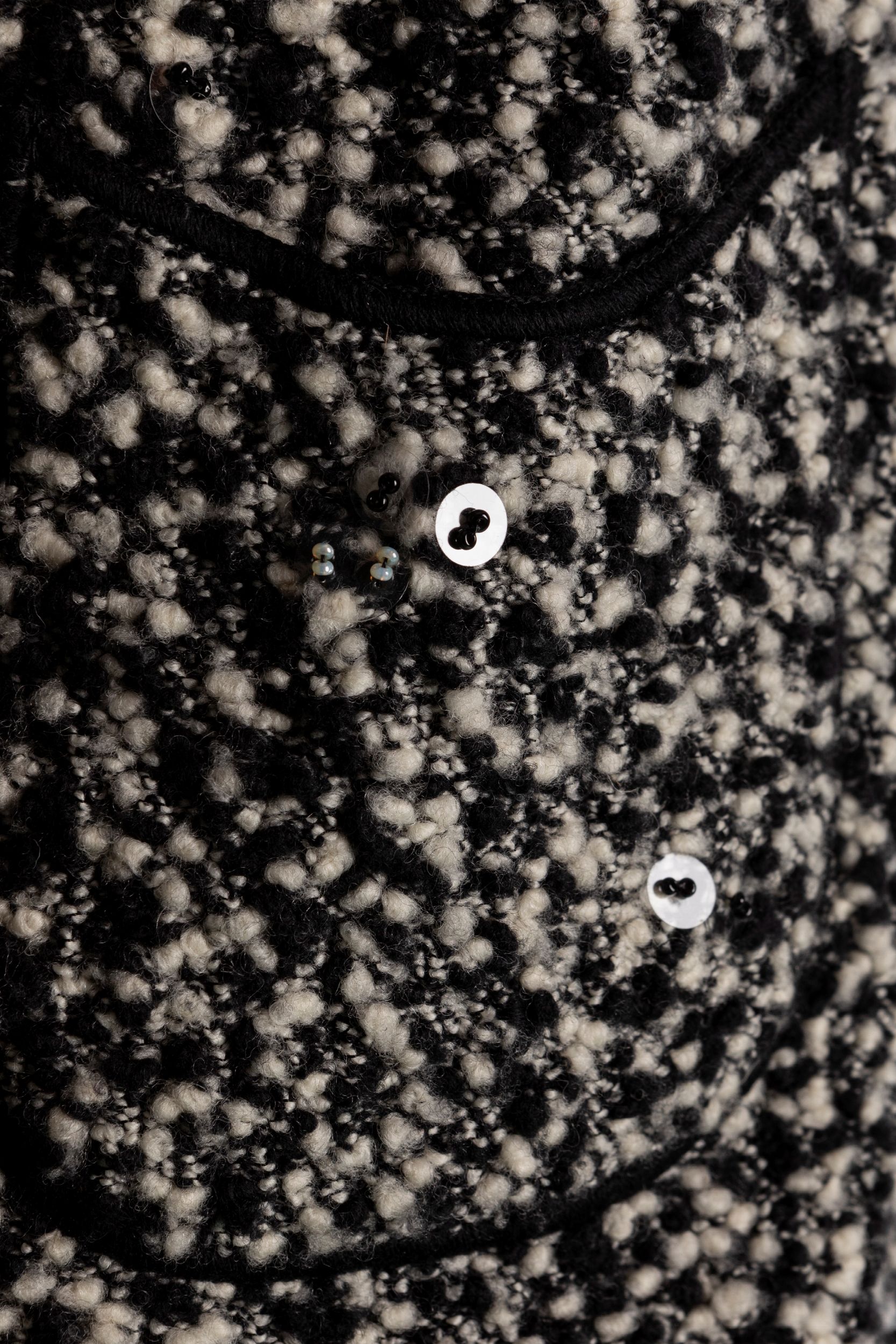 da un abito sfoderato senza maniche con tasche frontali, lana bouclé bianco e nero, e da una giacca a manica lunga, bottoni logati, applicazioni di paillettes trasparenti, etichette della taglia staccate, con custodia