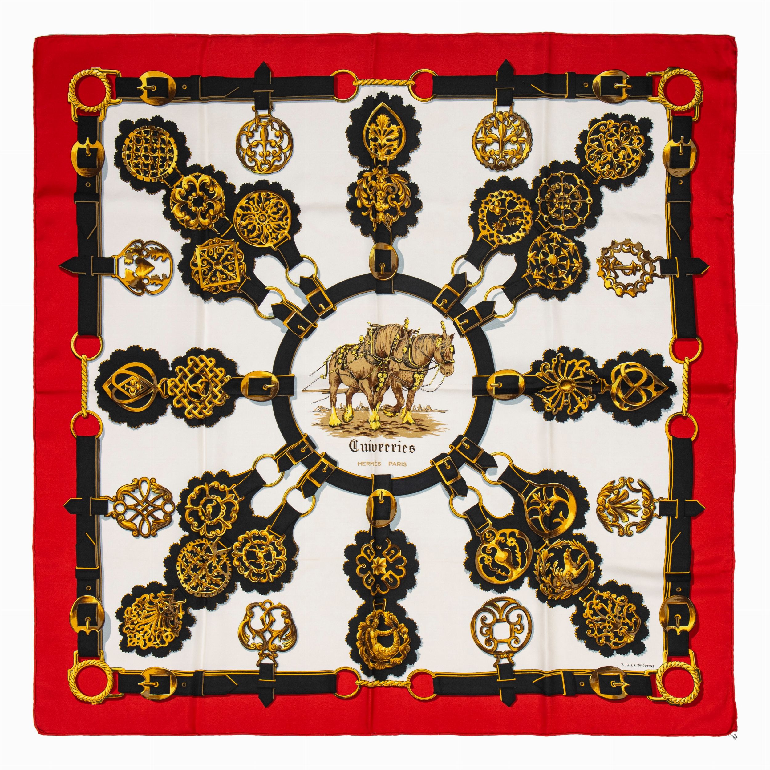 1985 in seta su fondo color panna, bordo color rosso, Françoise De La Perrière, con scatola