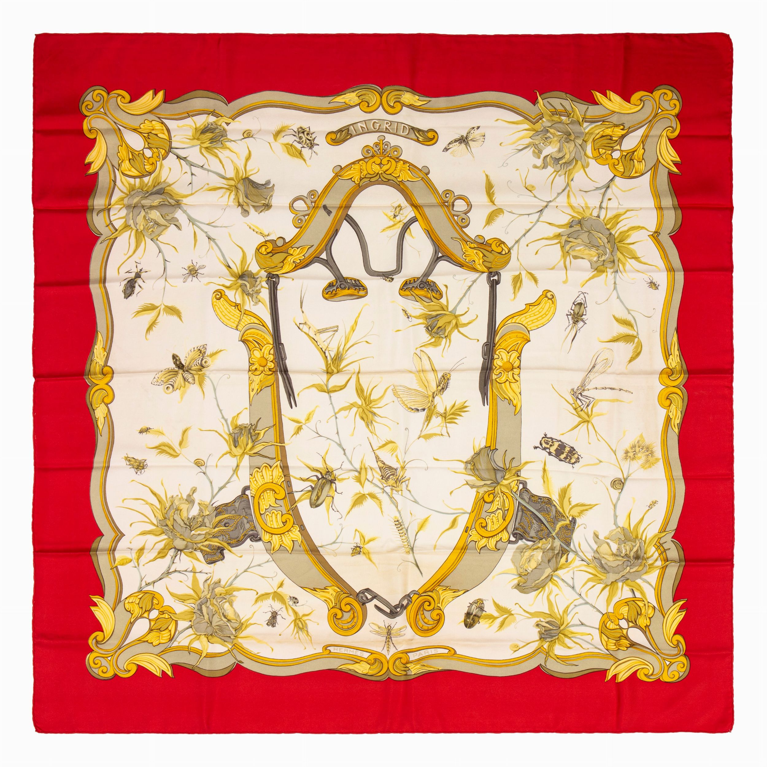 in seta su fondo color panna, bordo color rosso, Lenke Szechwnzyl (molto raro, lievi difetti)