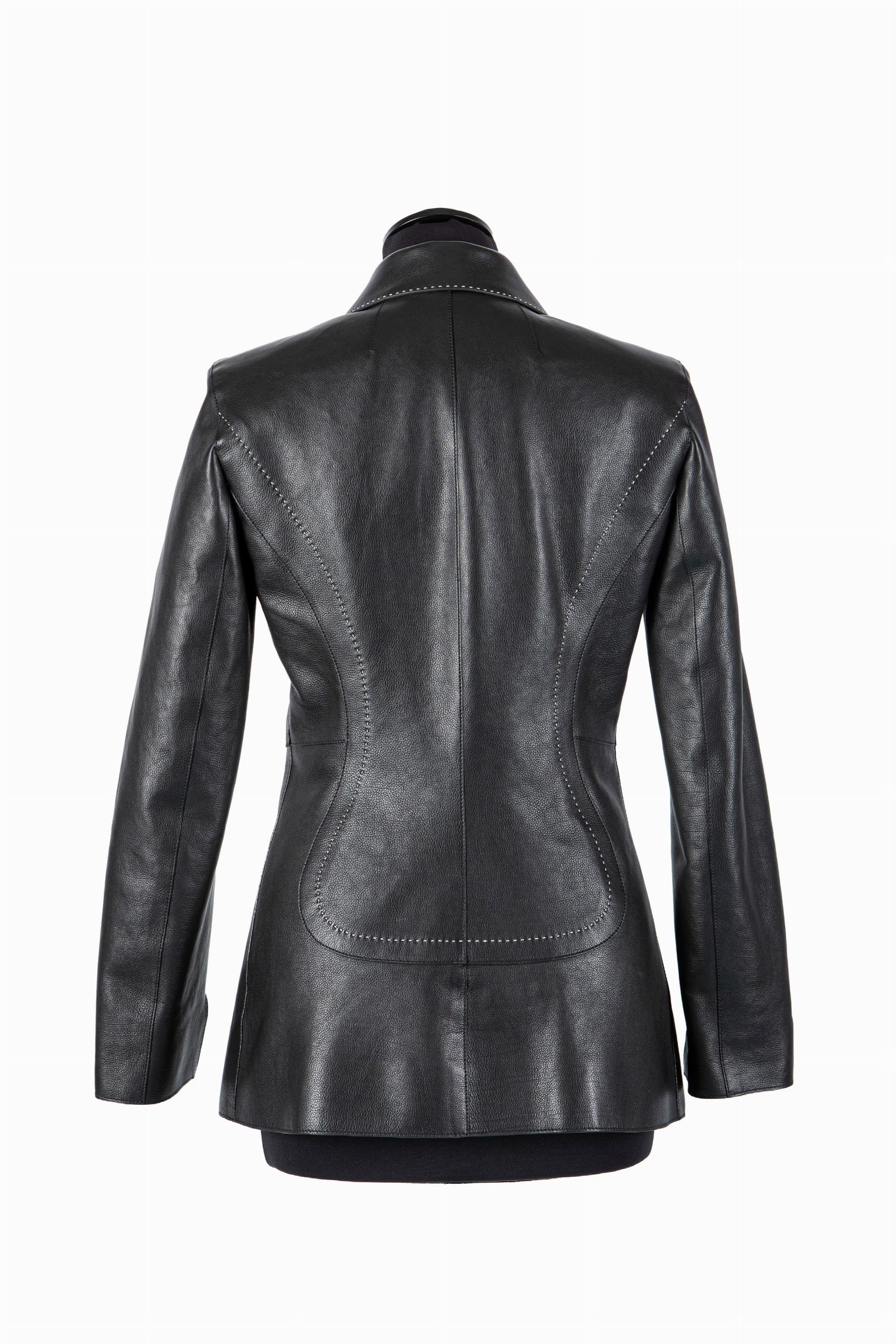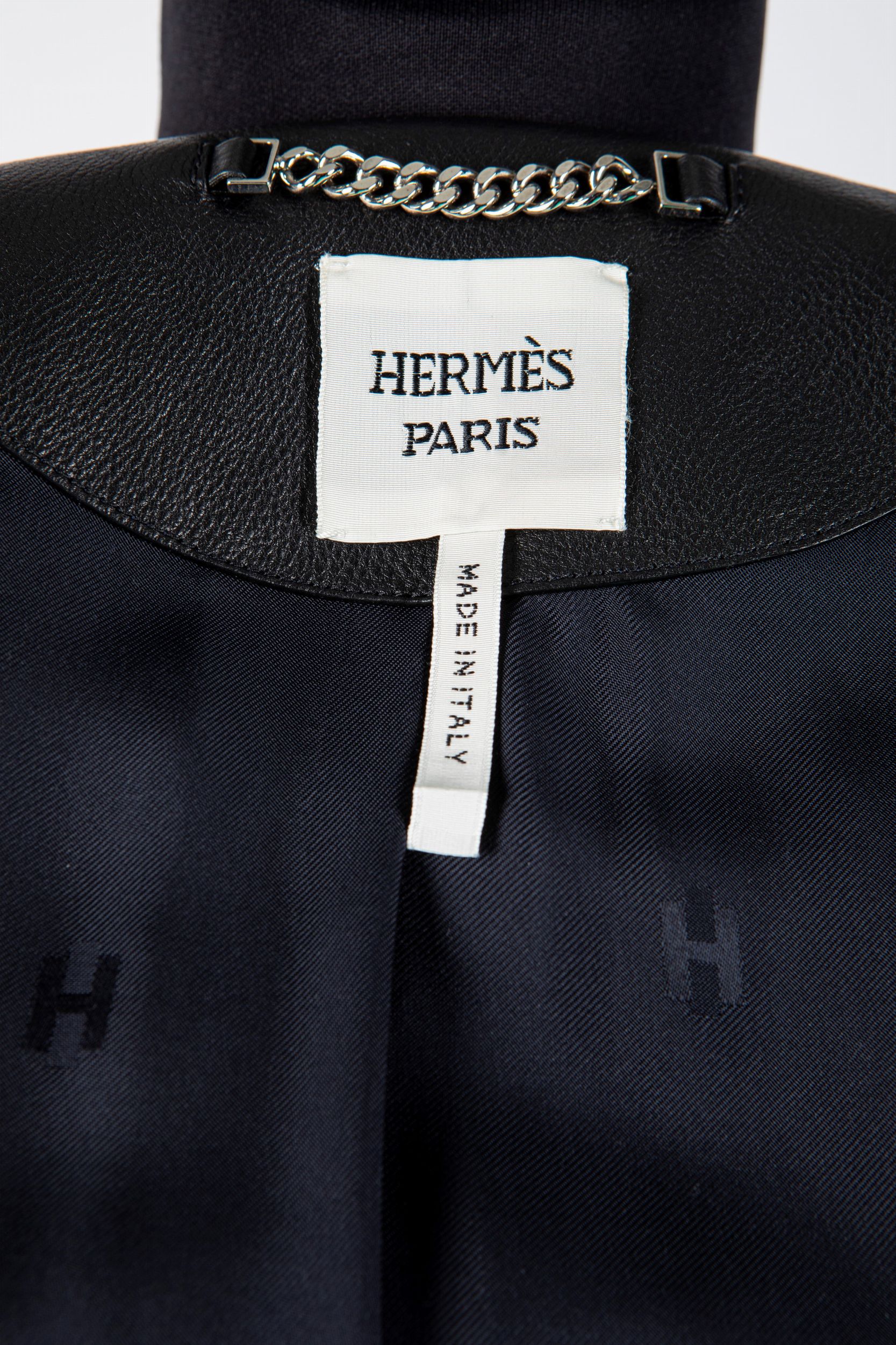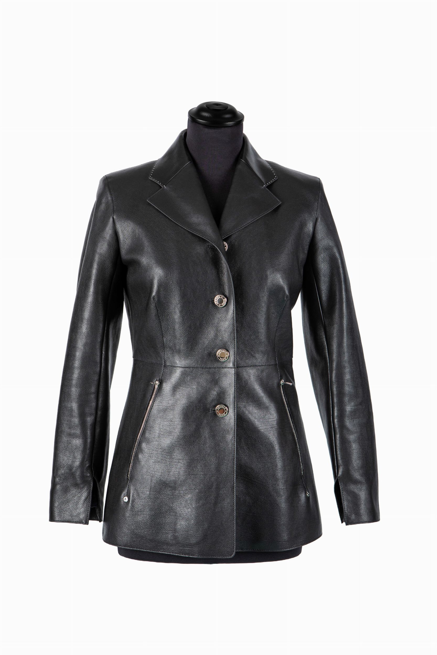 a manica lunga in pelle color nero, bottoni clou de selle in metallo, fodera in seta, doppie tasche con chiusura a zip, taglia 34 francese, con custodia