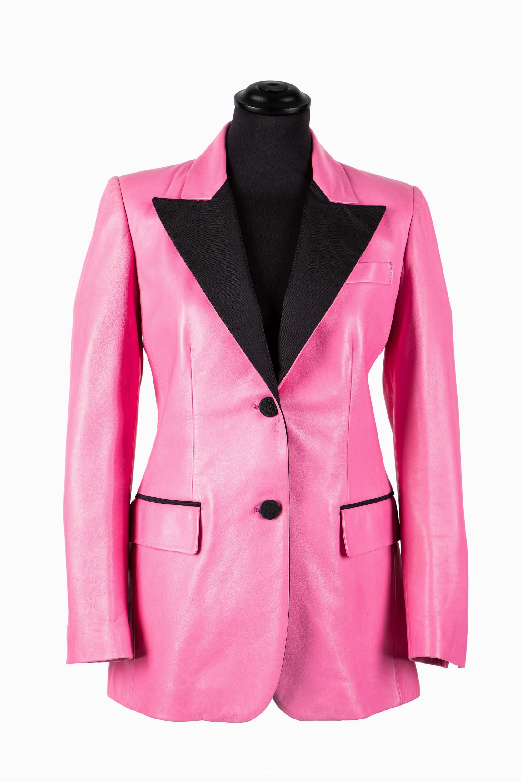 a manica lunga in pelle color fucsia, revers in cotone color nero, taglia 42 italiana, con custodia