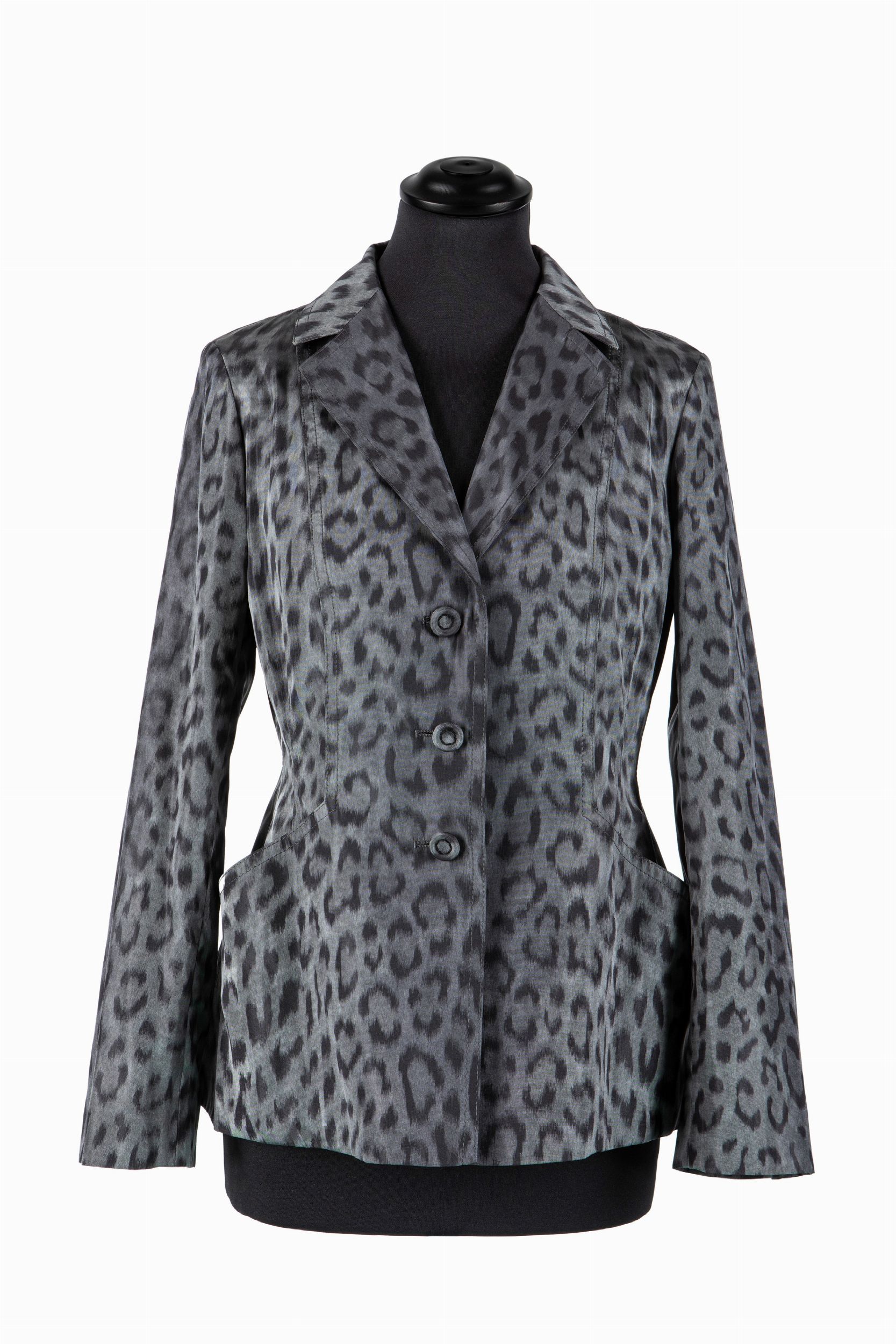 a manica lunga sfoderata in seta stampa animalier color grigio, taglia 40 francese, con custodia