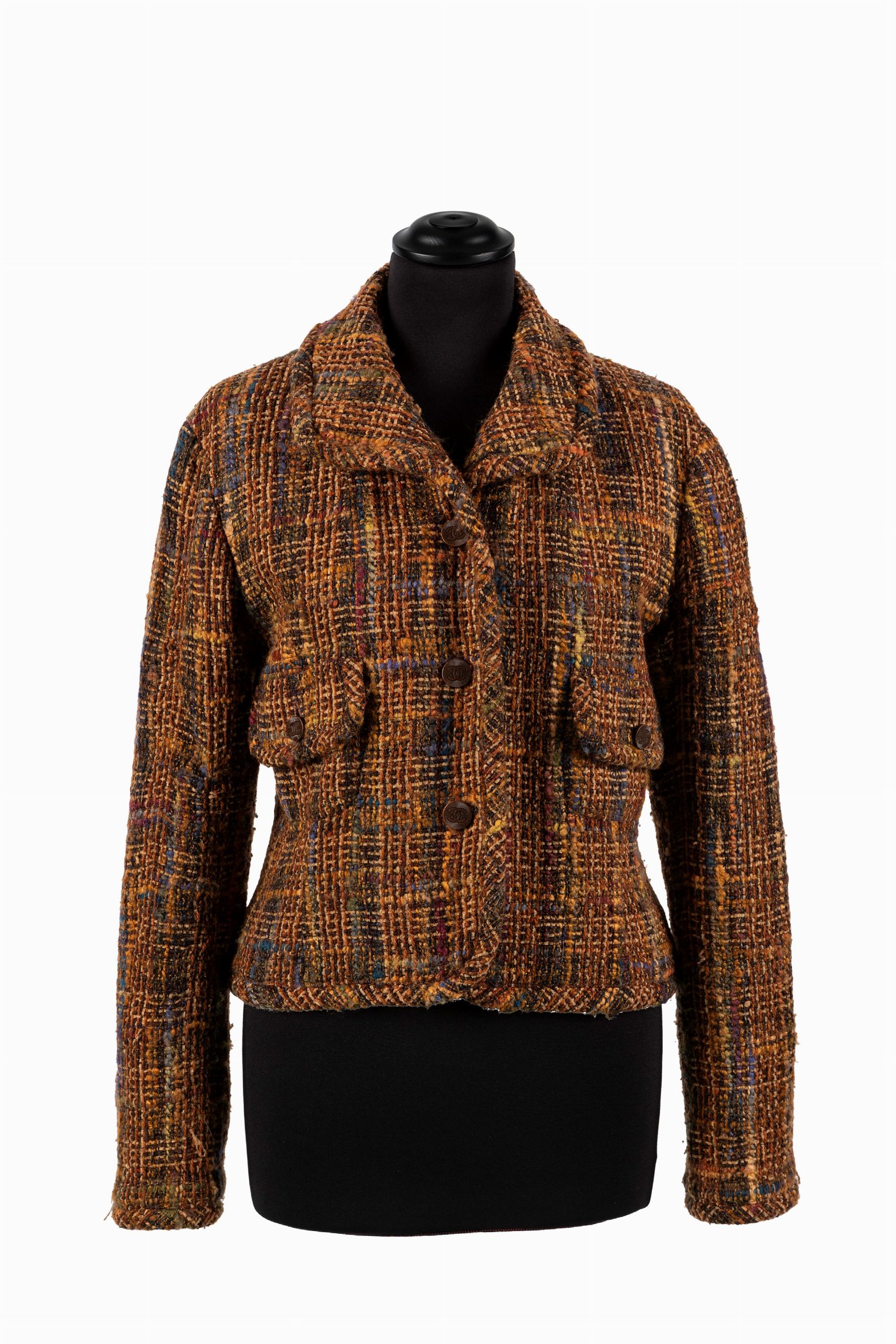 in lana bouclé colori vari, bottoni in metallo logato, fodera in seta, taglia 38 francese (difetti)