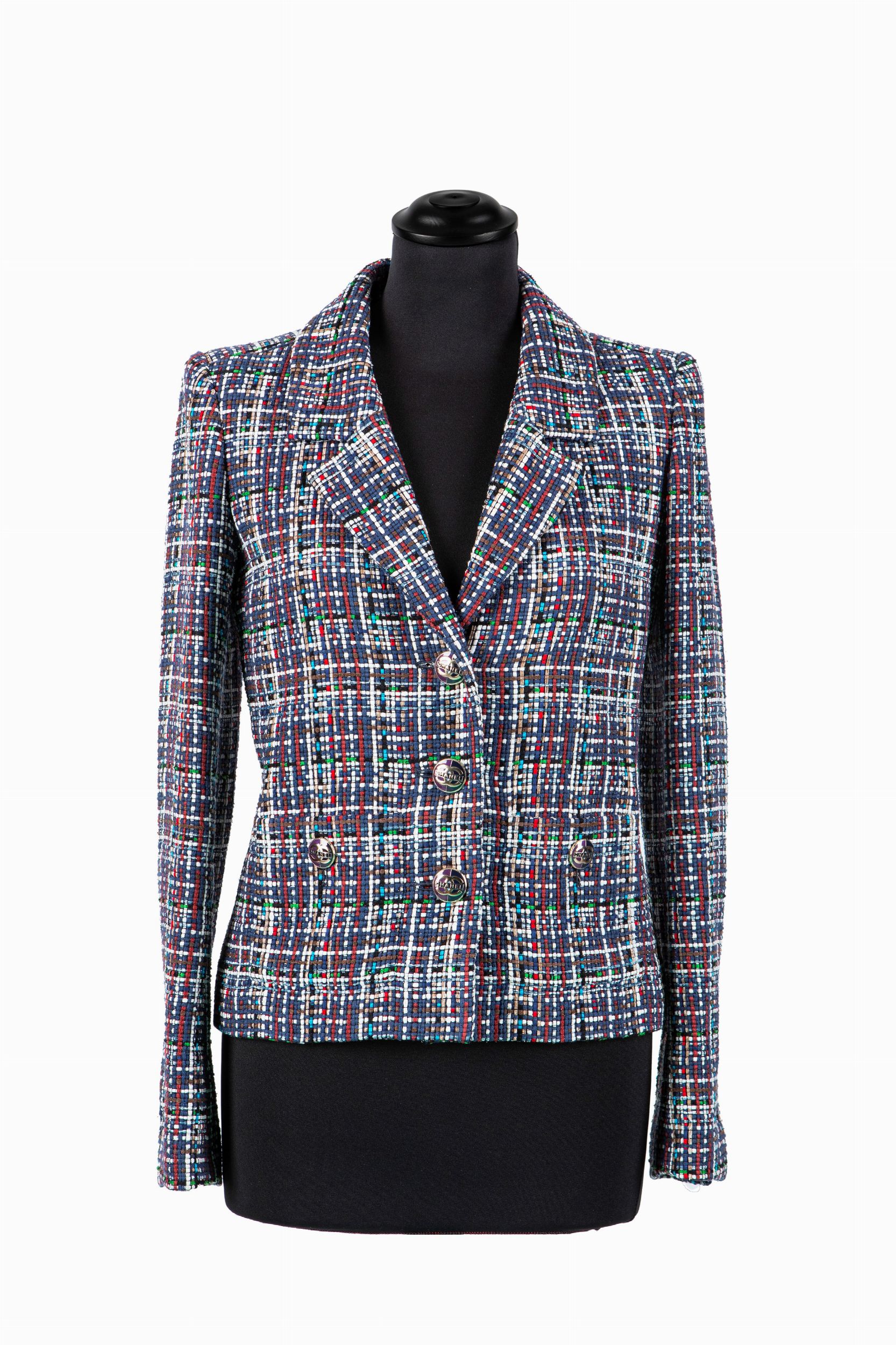 a manica lunga in cotone e seta a quadrettini multicolor, fodera in seta color blu, bottoni in metallo e smalti logati, taglia 34 francese, con custodia