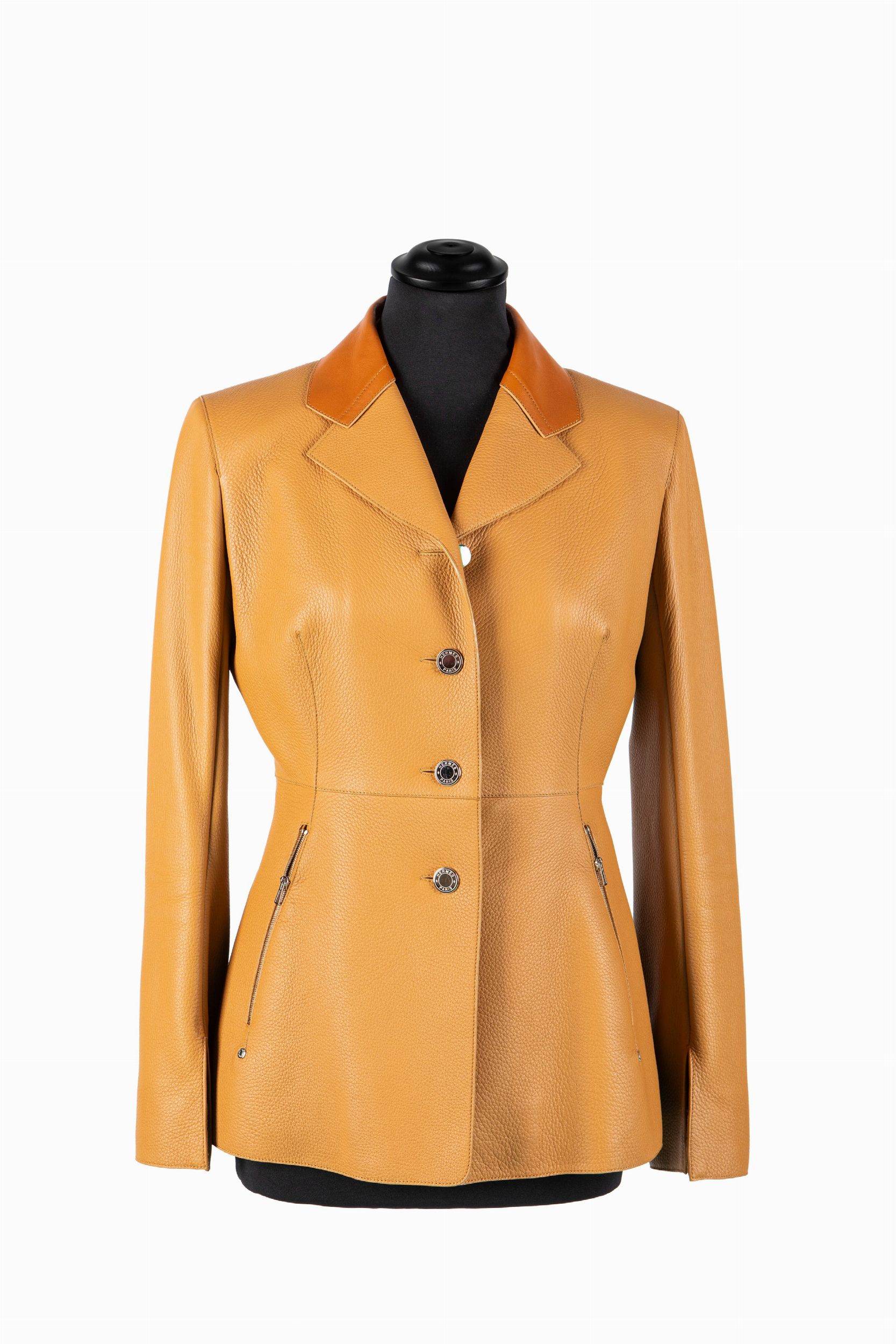 a manica lunga in pelle color marrone terra di Siena, bottoni in metallo clou de selle, fodera in seta, doppie tasche con chiusura a zip, taglia 36 francese, con custodia (nuova e mai usata, difetti)