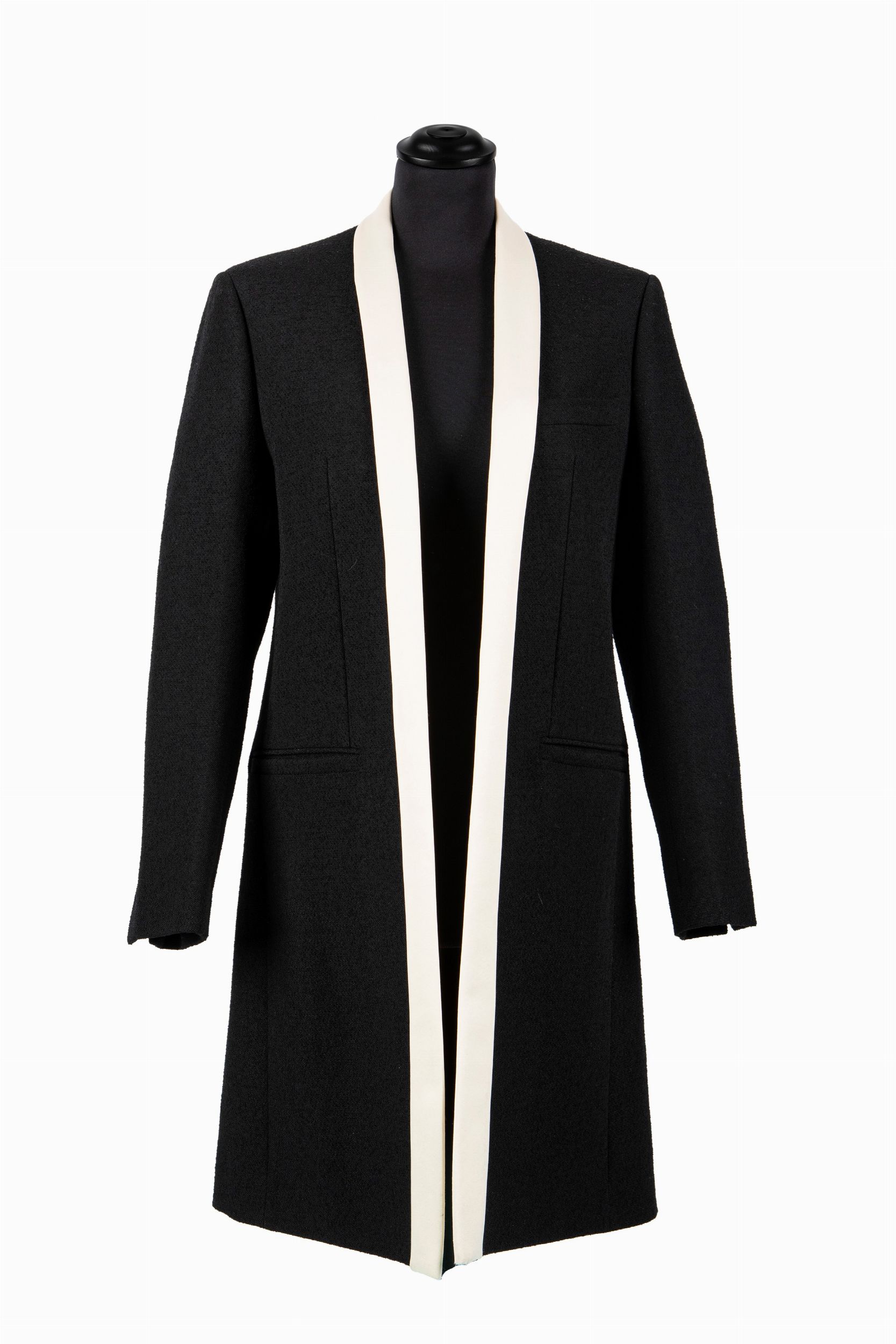 in lana color nero, profili in raso color crema, fodera in seta, bottoni logati, taglia 34 francese, con custodia