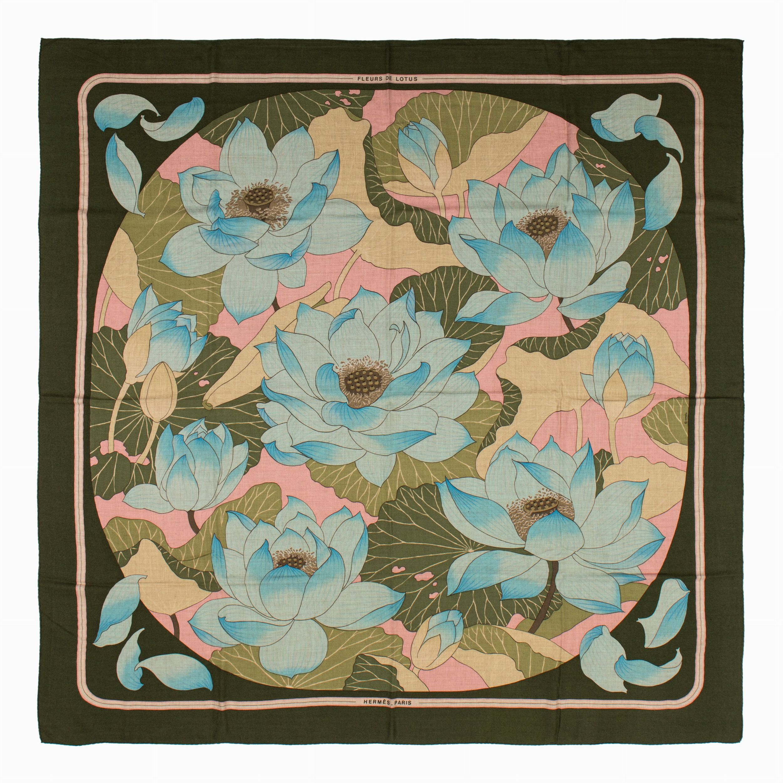 in cachemire e seta su fondo color verde salvia, Christiane Vauzelles, cm 135 x 135 (lievissimi difetti)