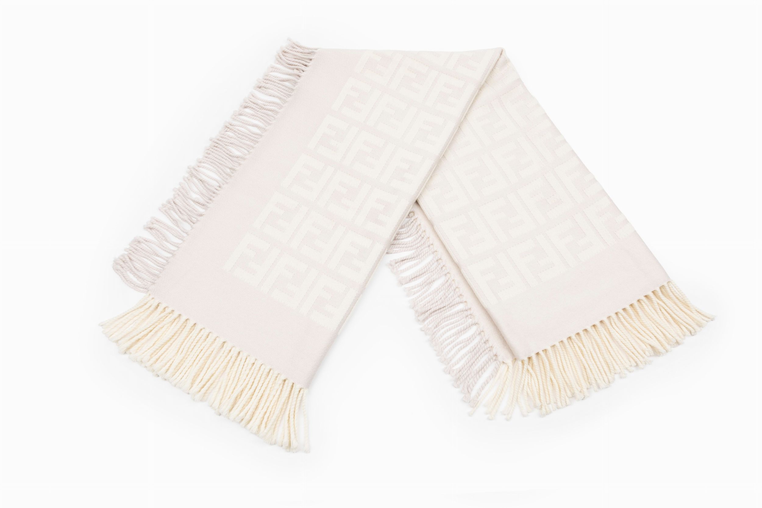 in cachemire monogrammato, doubleface color rosa pallido e crema, con frange, cm 104 x 104, con sacchetto (lievissimi difetti)