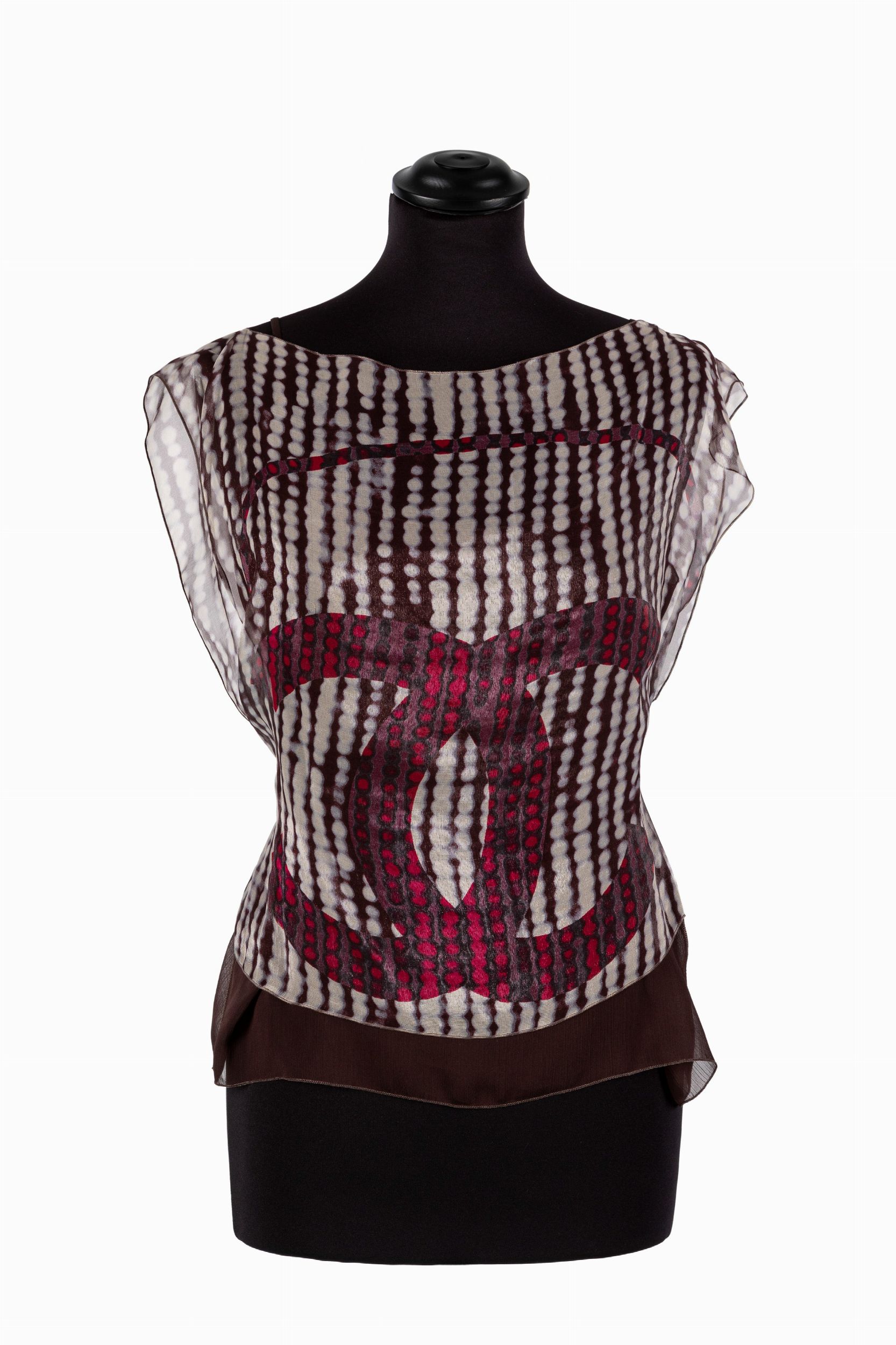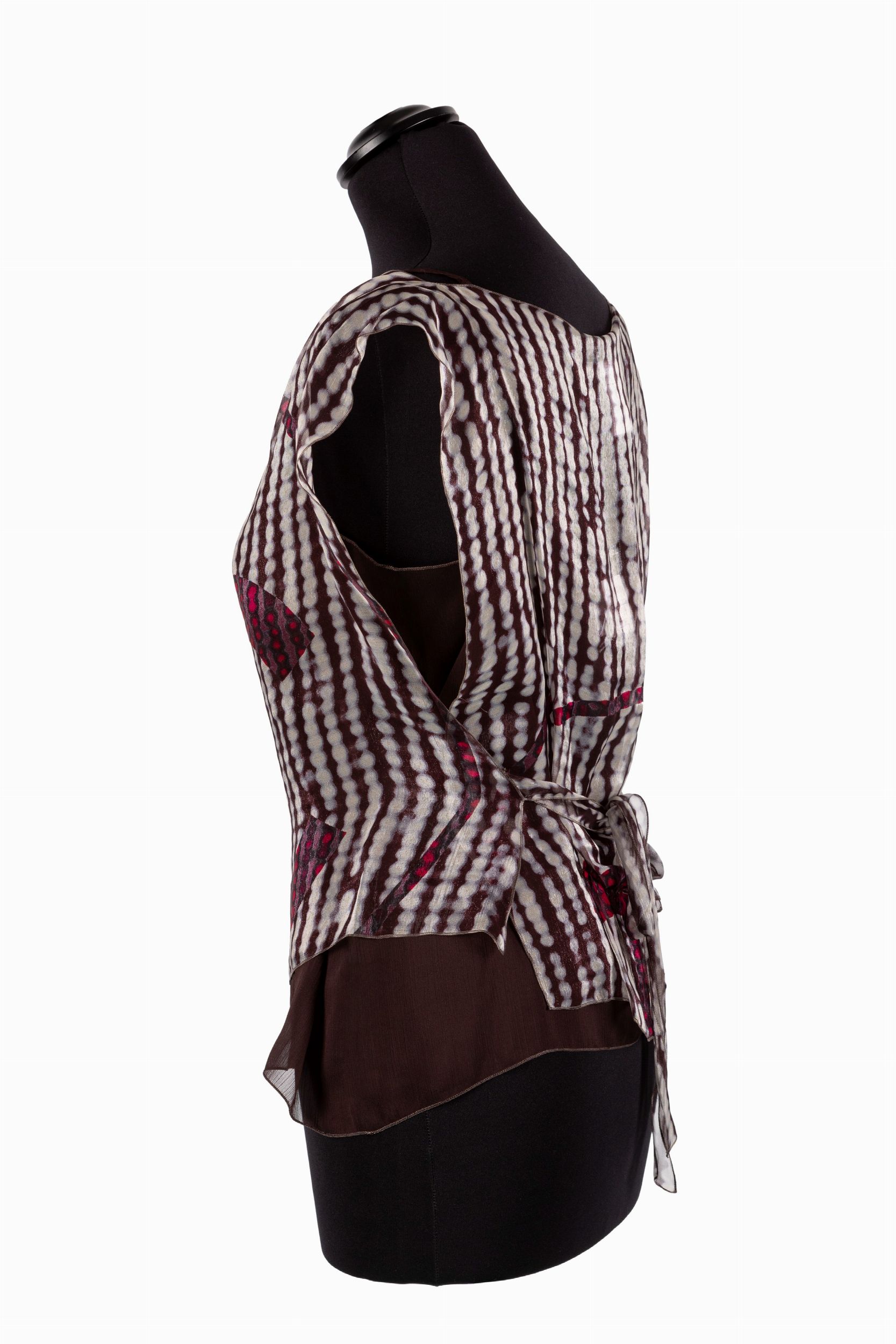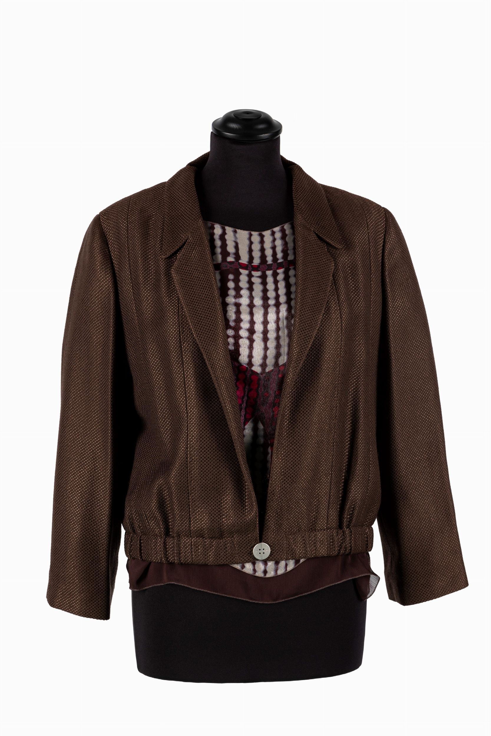 da un top in chiffon color marrone con spalline, taglia 42 francese, una camicetta stampa fantasia, taglia 38 francese, e da una giacca a manica lunga in misto lino color tabacco, fodera in seta stampata, taglia 40 francese (lievissimi difetti)