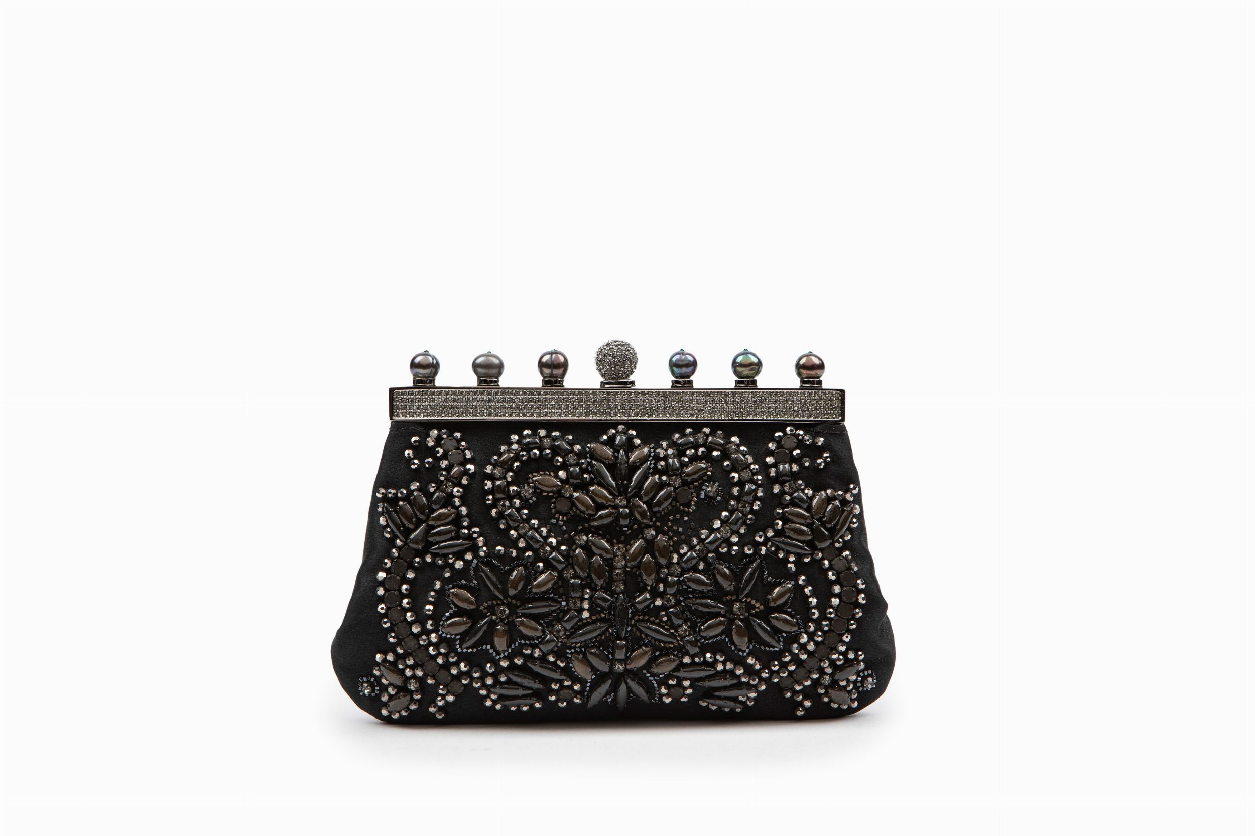 in raso di seta color nero, ricamo con perline di vetro, chiusura rigida con strass sormontata da sette boules in metallo brunito, con catena, cm 18, con sacchetto