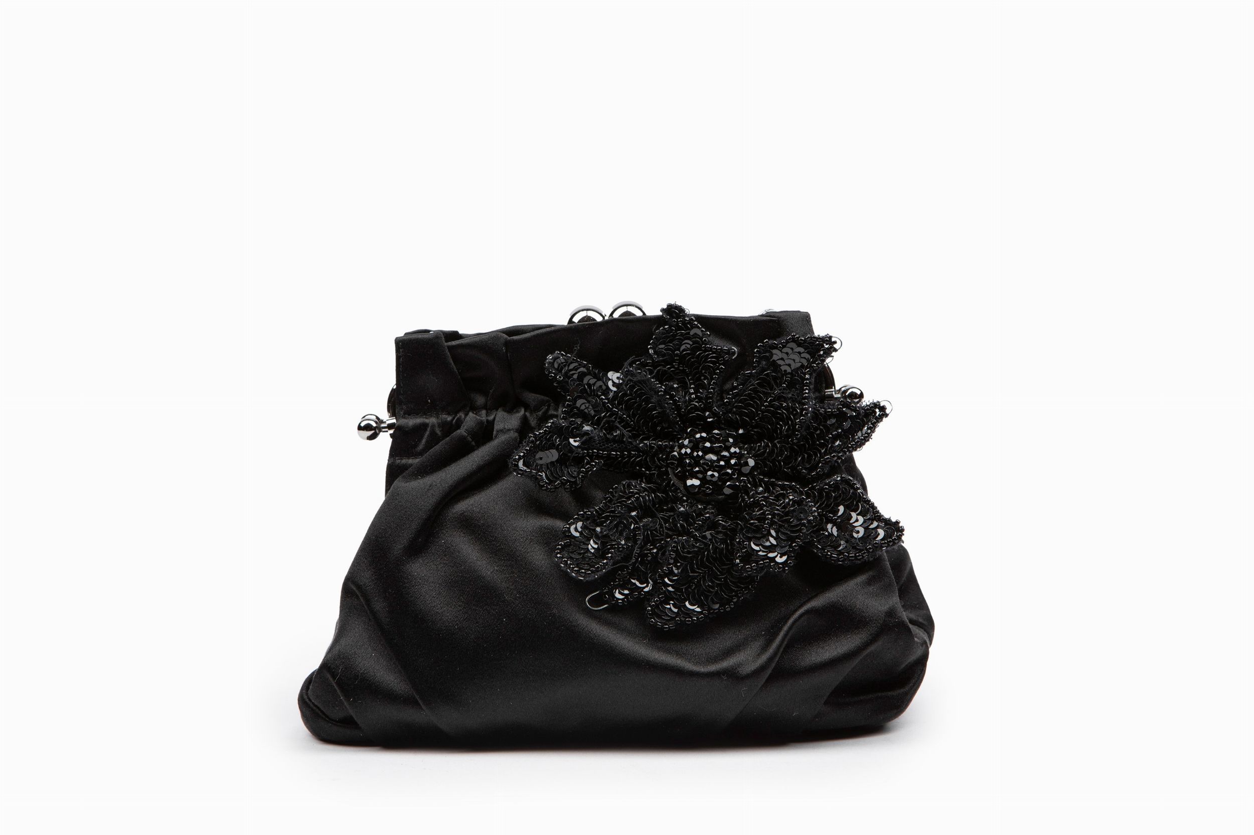 in raso di seta color nero, con grande applicazione a fiore in paillettes, dettagli in metallo, con catena, cm 20