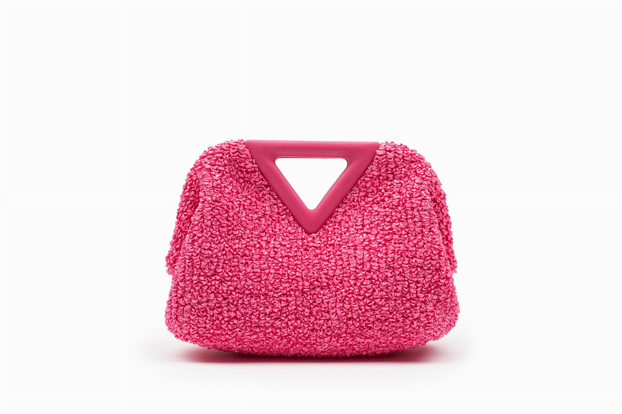 in rafia color rosa fucsia, manici sagomati, interno in pelle, cm 20