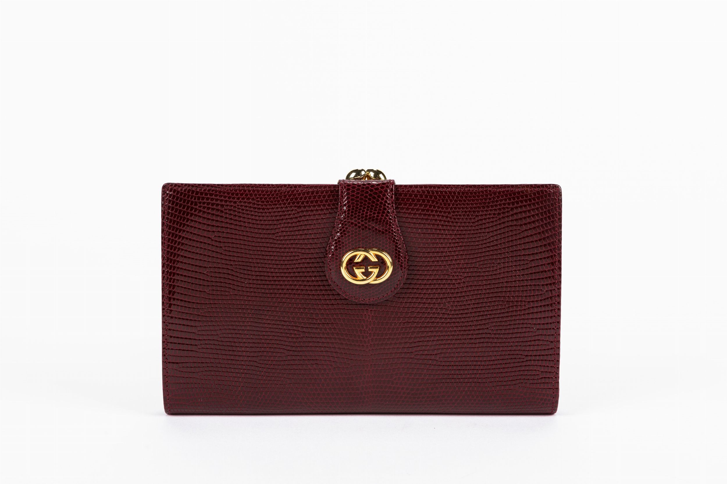 in pelle color bordeaux, dettagli in metallo dorato, cm 17,5x10 (chiuso), (lievi difetti)