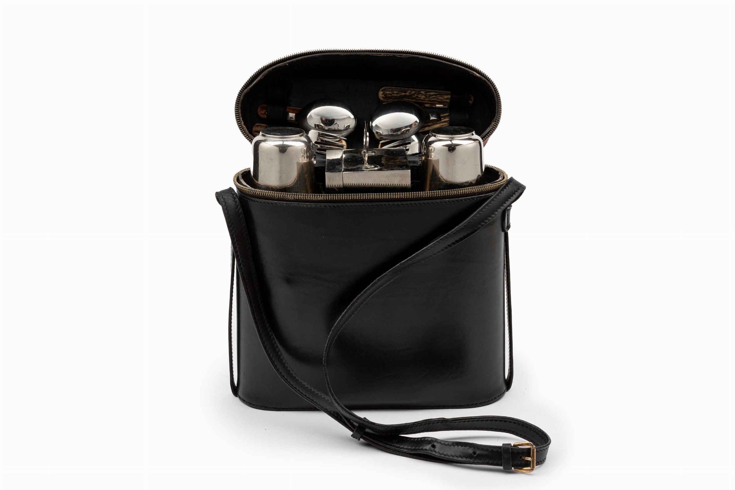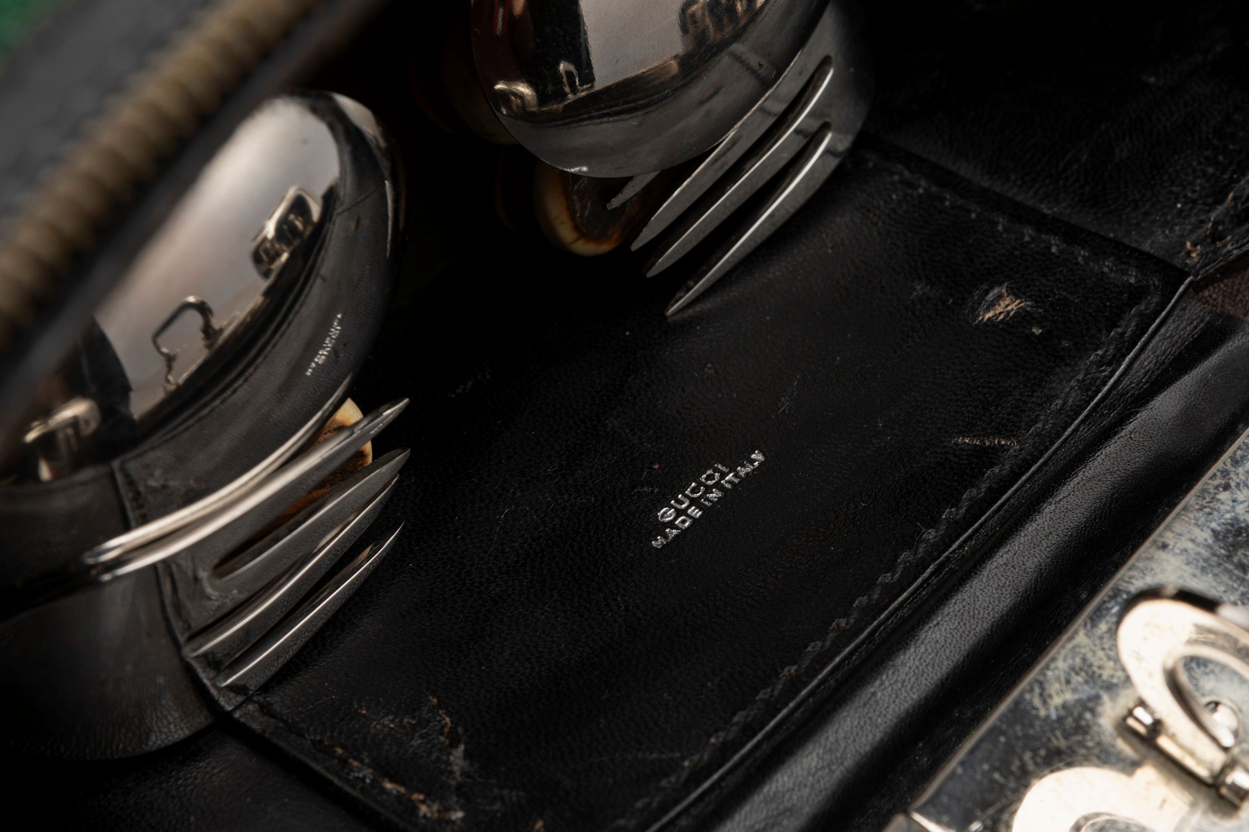 in pelle color nero con banda web bicolore verde e rossa, contenente cinque posate pieghevoli, due thermos e una scatola in metallo, con tracolla, cm 30 x 26 x 9 (difetti e un coltello mancante)