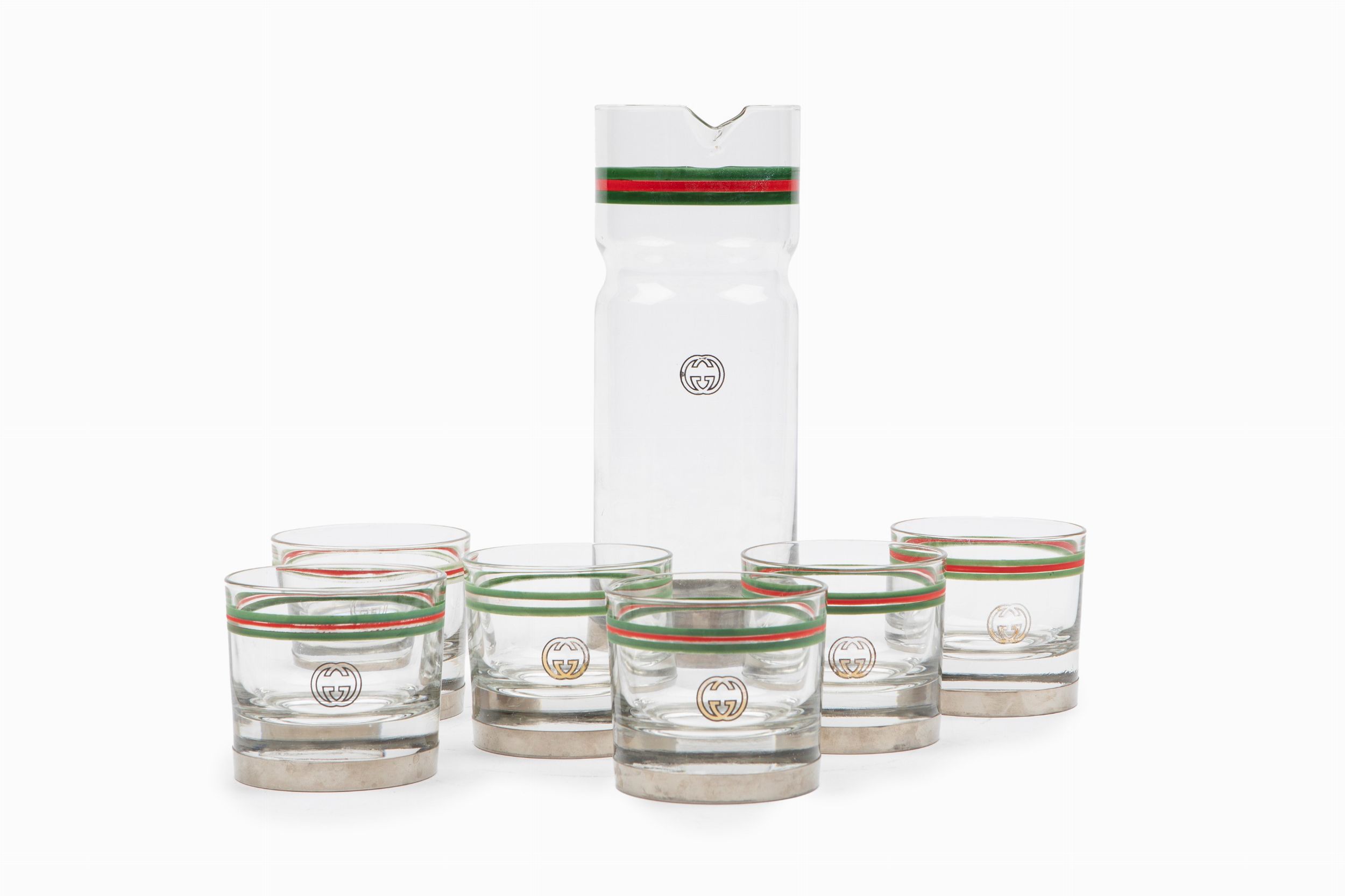 in vetro e base in metallo, con banda web bicolore verde e rossa, misura bicchieri cm 8 x 8 e brocca cm 9 x 26 (difetti)
