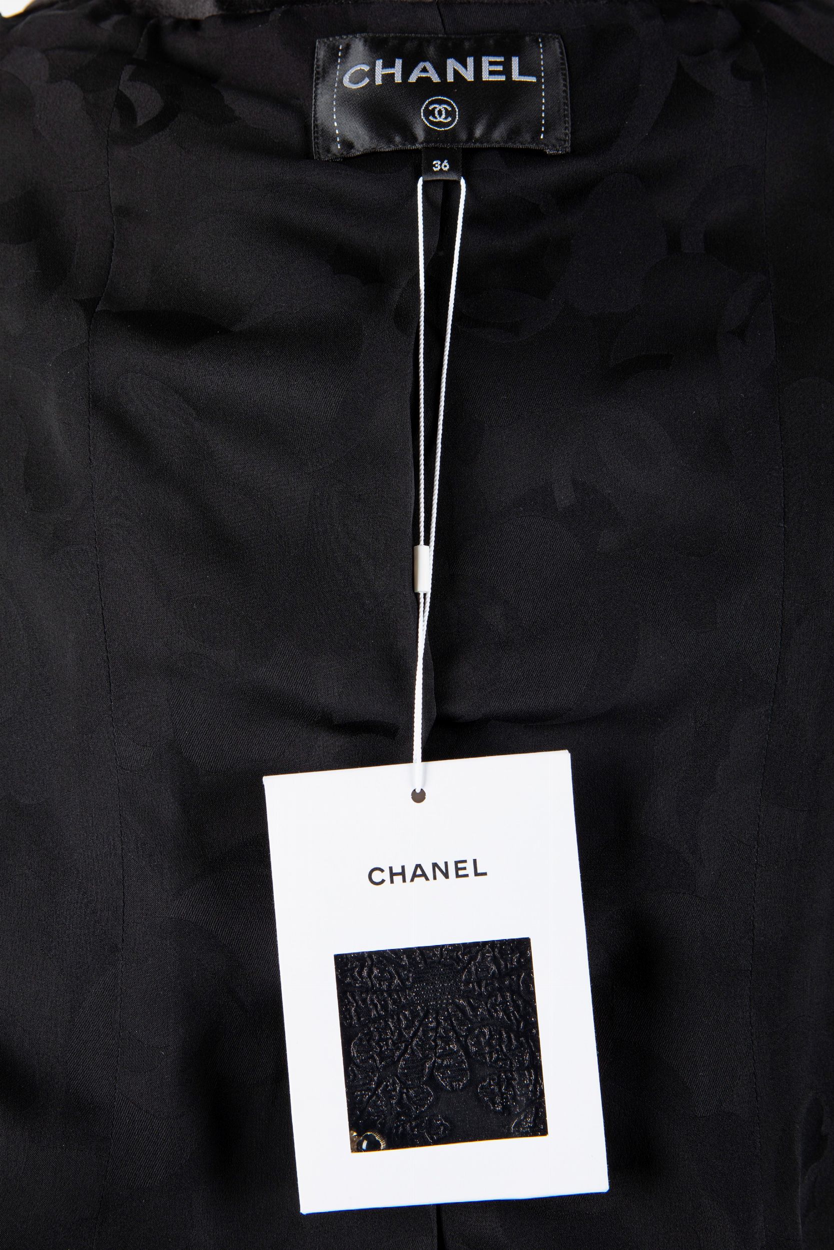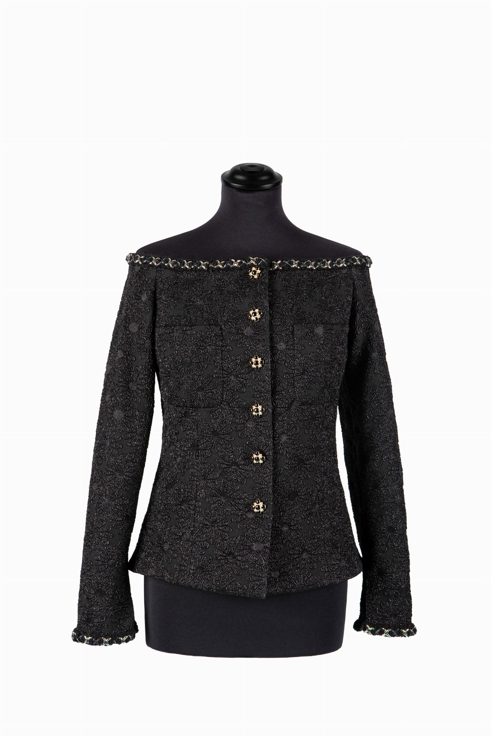 a manica lunga senza spalline in tessuto operato con ricamo floreale a rilievo, profili con motivo intrecciato, bottoni gioiello in metallo dorato e paste vitree, fodera in seta, taglia 36 francese, con custodia (nuovo e mai usato)