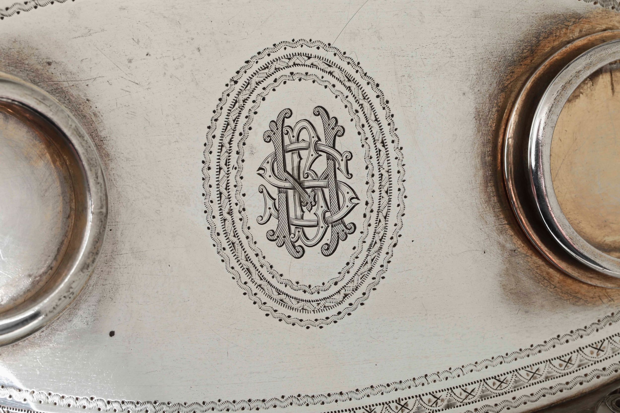 Calamaio. Argento fuso e traforato. Boccette globulari in vetro molato. Londra 1826. [..]