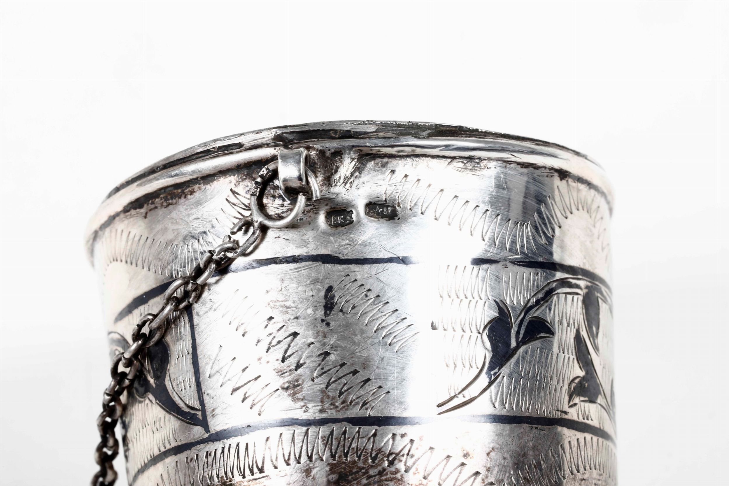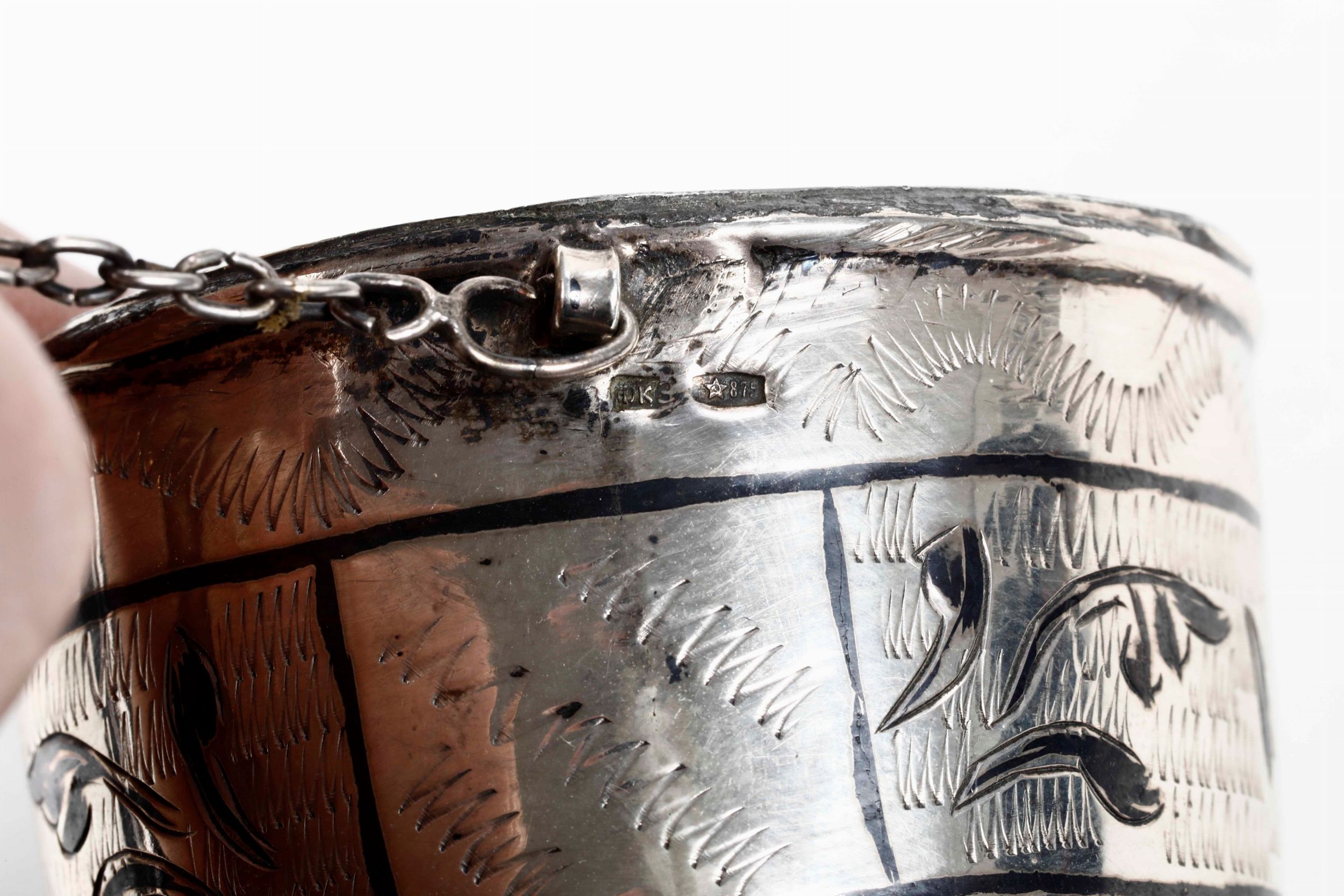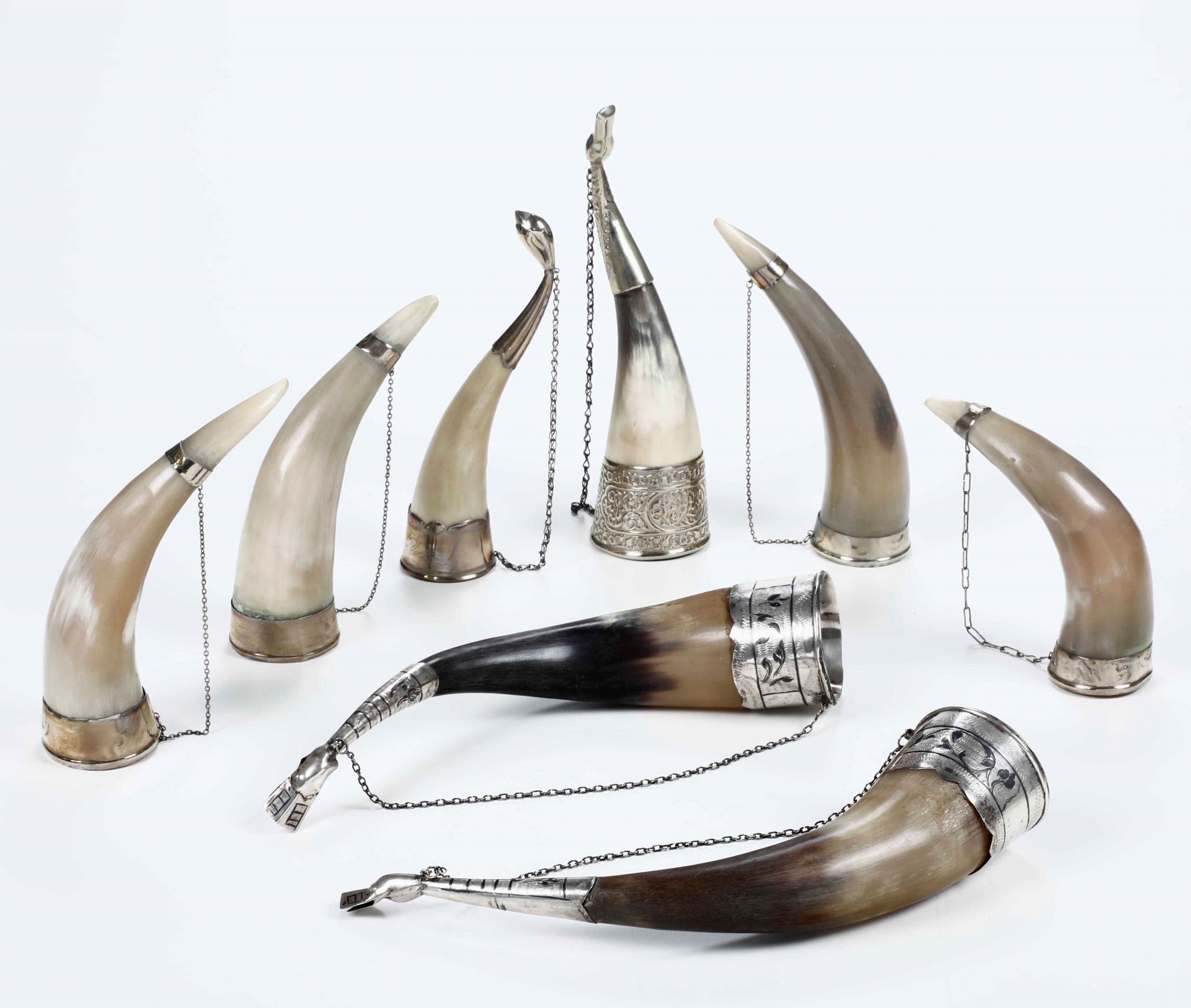 Insieme di otto corni potori Corno animale e finimenti in argento sagomato e ces [..]