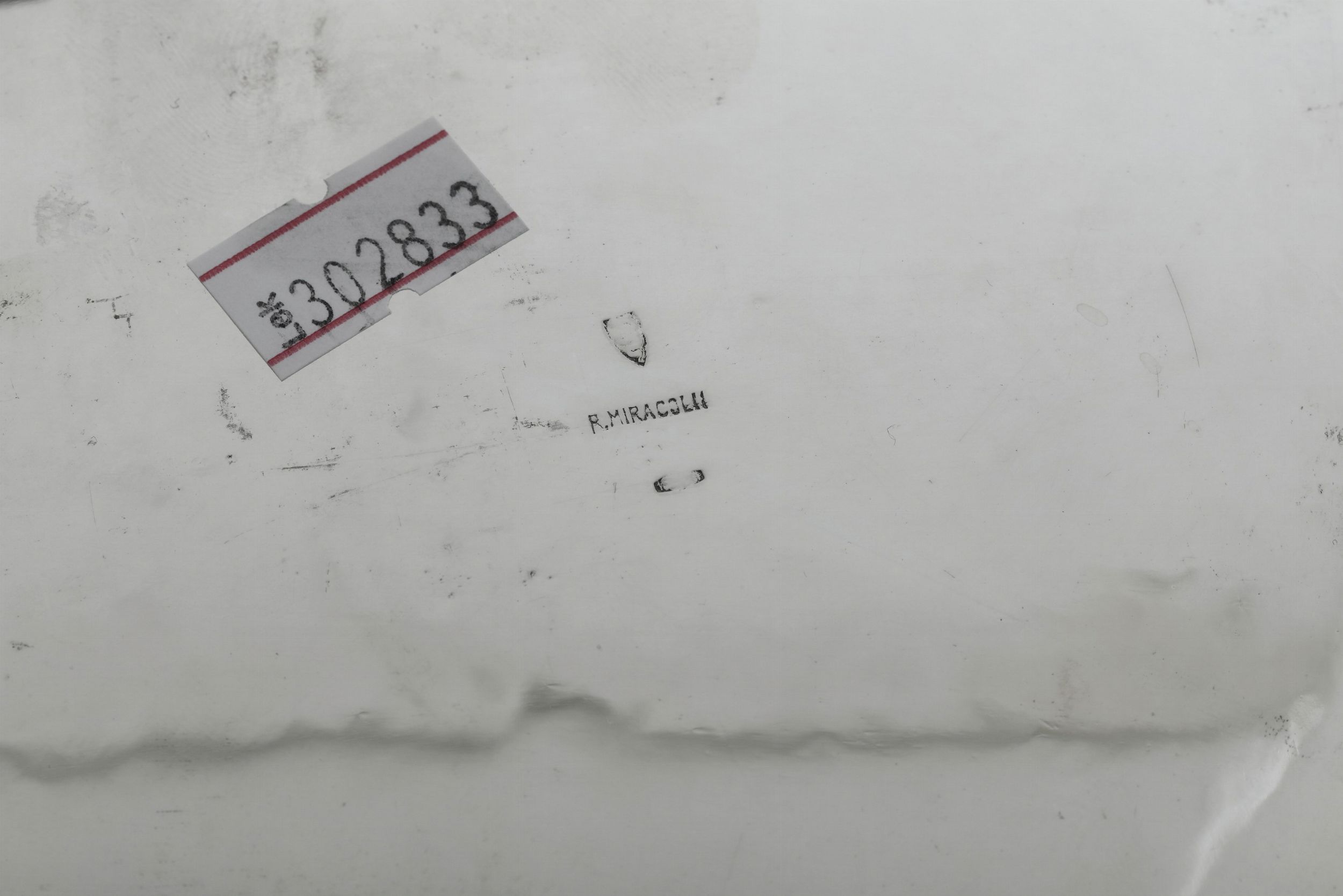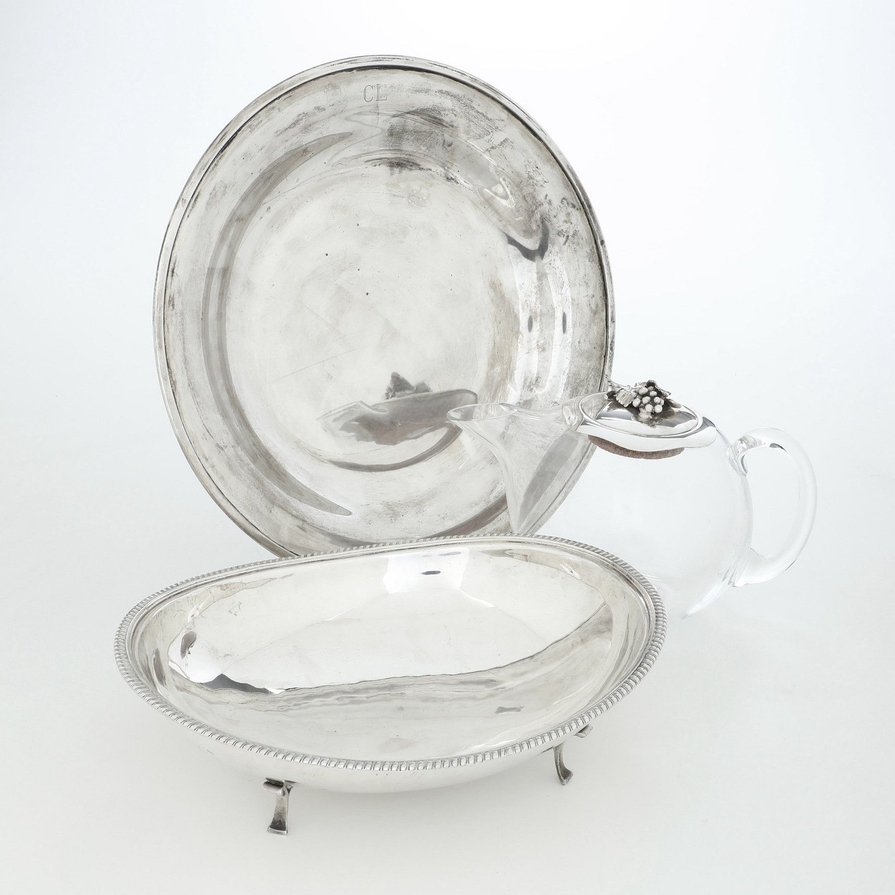 Piatto, centrotavola con piedini e bottiglia con tappo in argento. Argenteria italiana [..]