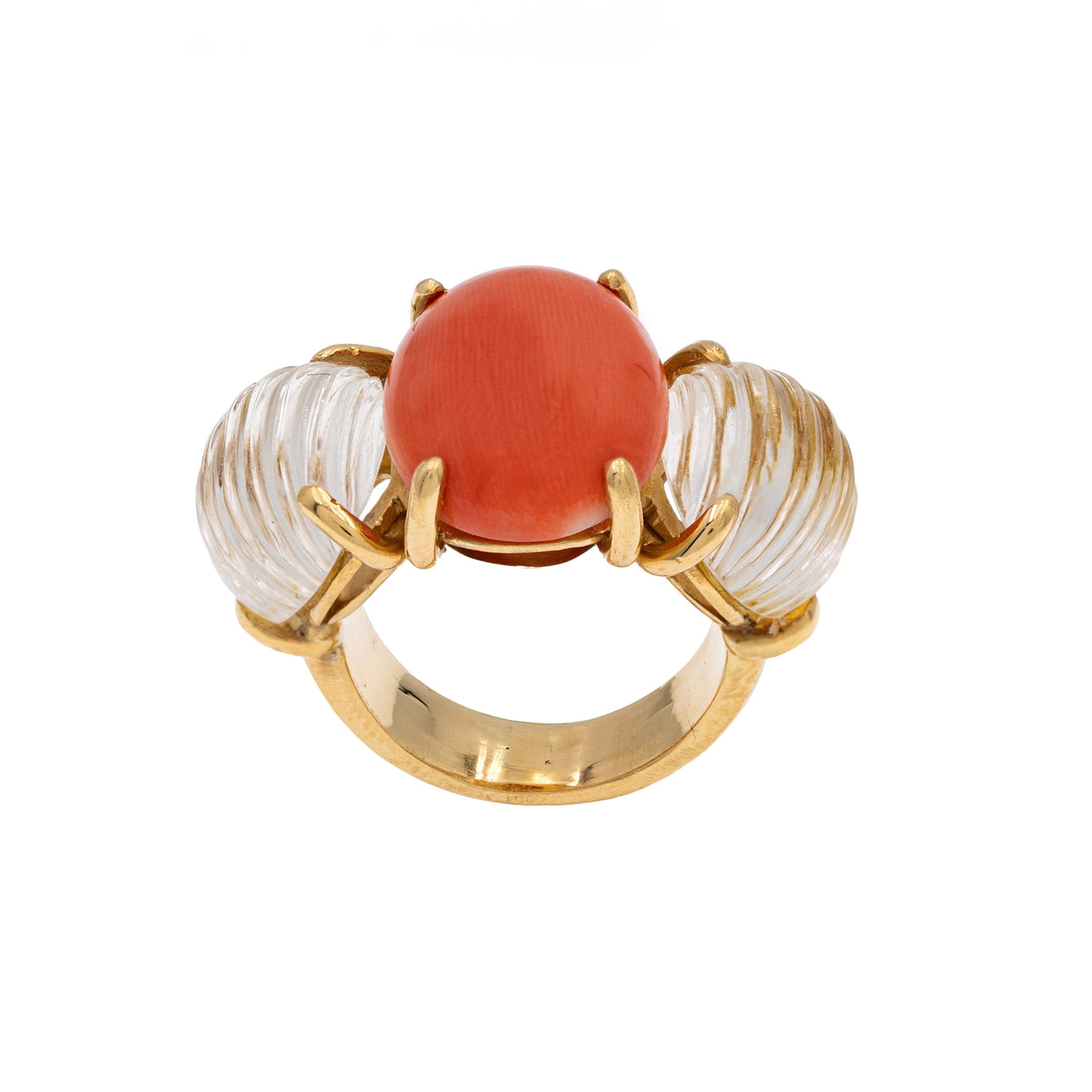 Anello in oro giallo 18kt corallo e cristallo di rocca a melone