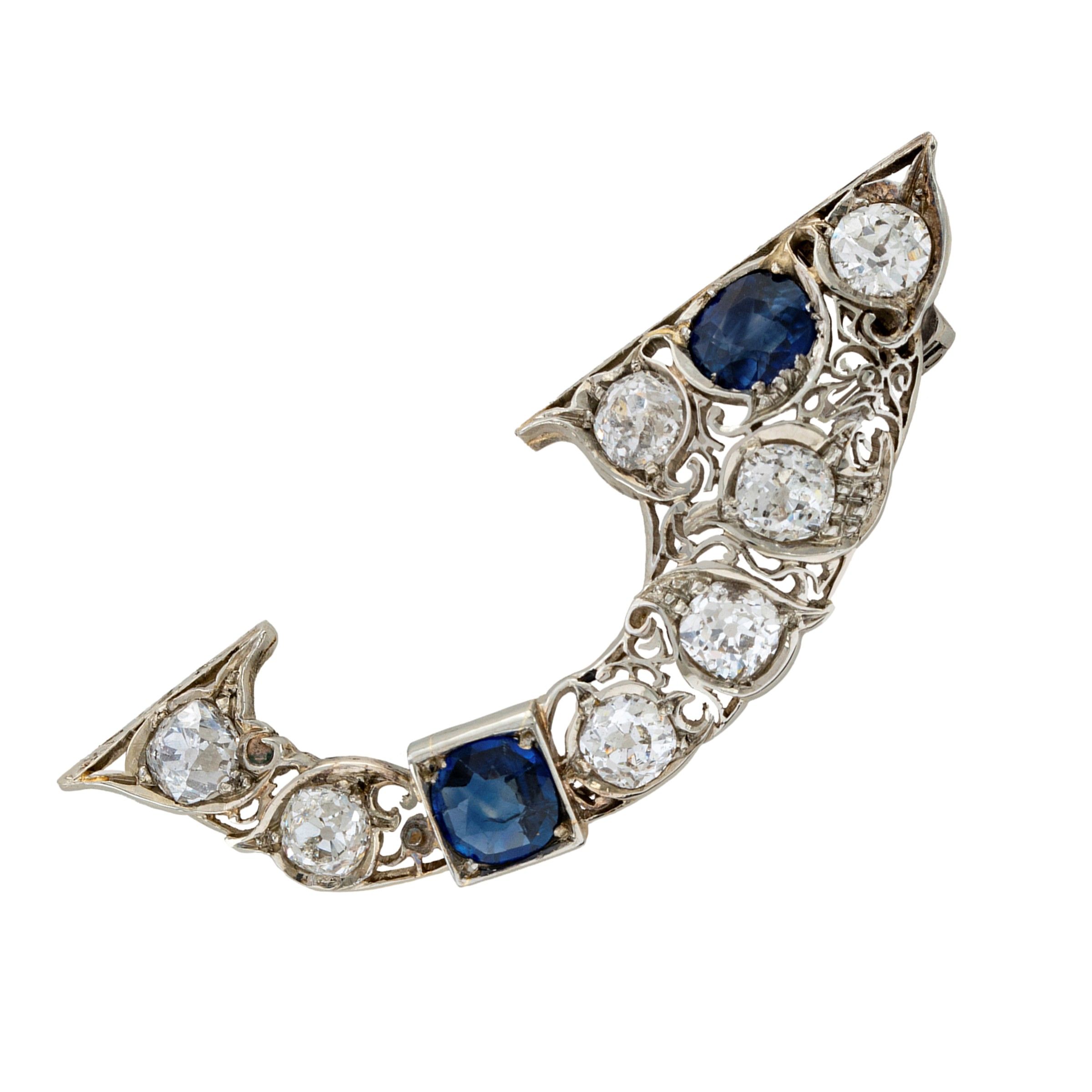 Antica spilla cornucopia in platino zaffiri e diamanti